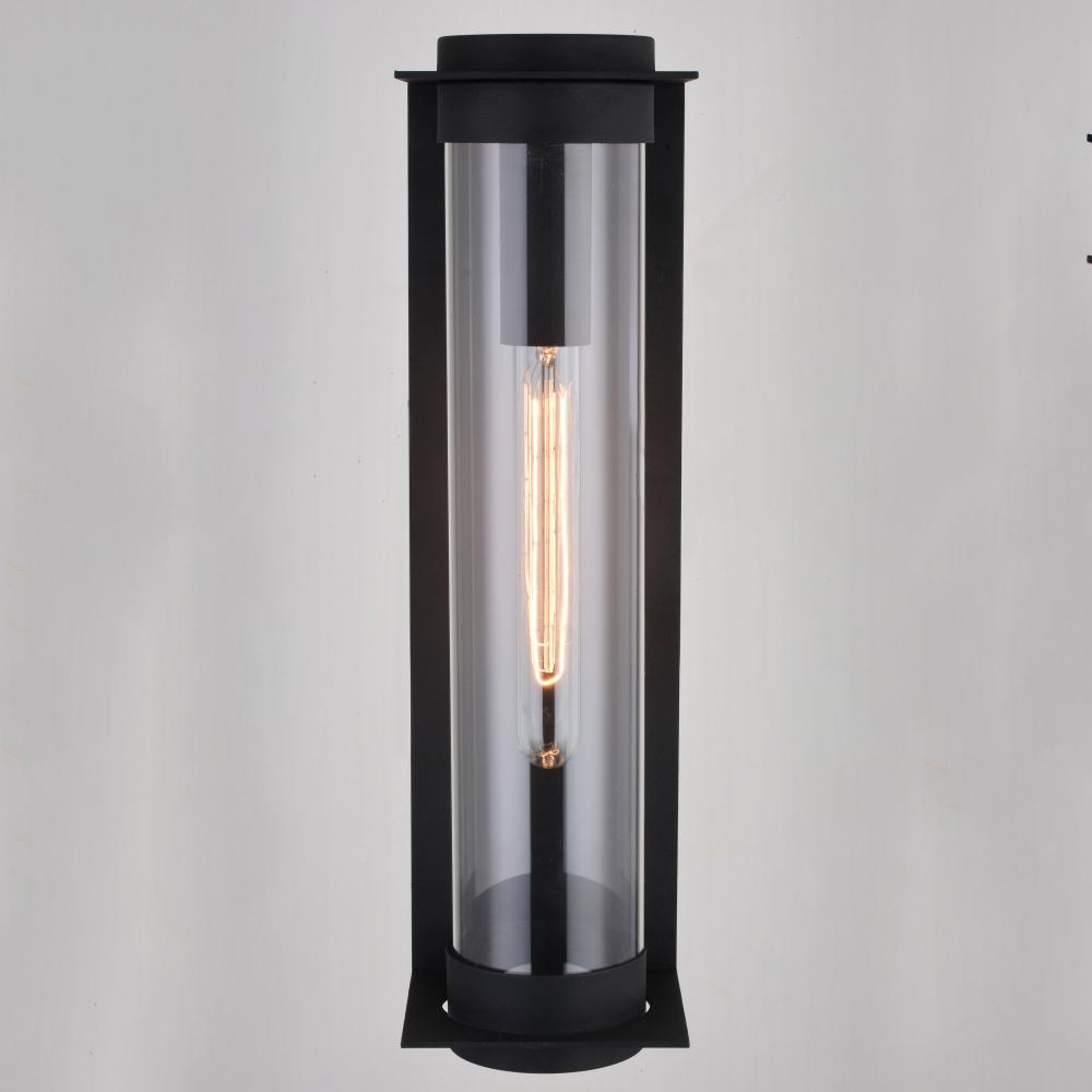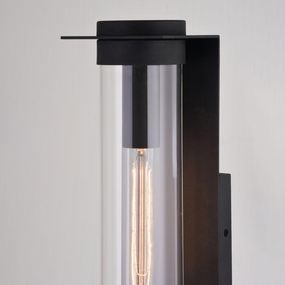 A long slim tube accentuates the grace and class shown in the Brighton Park collection. A striking textured black metal frame supports and suspends the clear glass cylinder showcasing a generous display of light. This linear outdoor lighting collection is a clean accent suited for any contemporary space. Add this wall mount sconce light to any entryway, garage, or patio for that stylish touch.