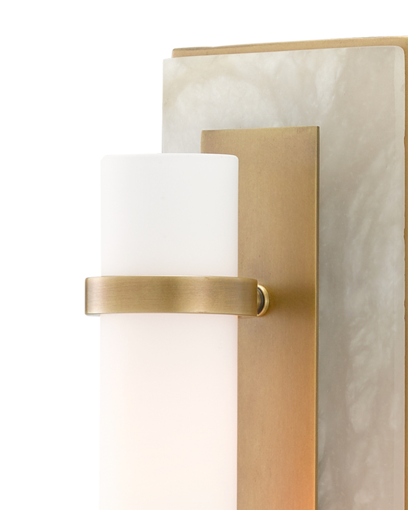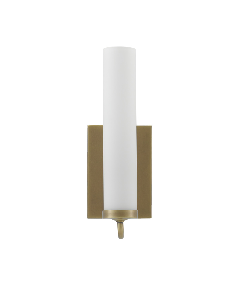 The arcing arm of the Brindisi Brass Wall Sconce defines the gracefulness of this design, the disc-shaped bobeche atop the tubular support serving as the perch for the tall, thin opaque glass canister shade. Made of metal in an antique brass finish, the cleanly designed gold wall sconce with its softly glowing white shade is certified for damp locations. Part of the Bagno Collection of wall sconces designed for bathroom spaces.