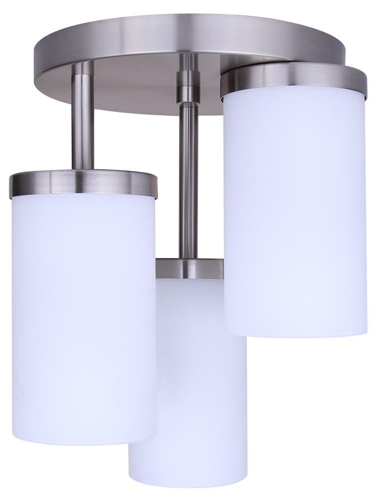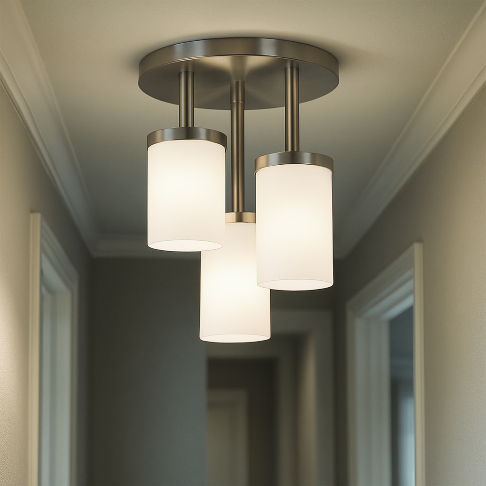 Add a modern touch to your ceiling with the BRITTON 3-light semi-flush mount in brushed nickel. This stylish fixture features three flat opal glass shades that provide bright, even light while complementing both modern and transitional interiors. Measuring 10.62” wide by 12.87” high, it’s perfect for lower ceilings in entryways, hallways, bathrooms, or bedrooms, offering plenty of illumination without taking up too much space. Designed to hold three 60W Type A bulbs, it’s ideal for ambient or task lighting wherever you need it. Easy to install and built to last, the BRITTON semi-flush mount combines function and style, bringing a sleek, refined look to any room.
