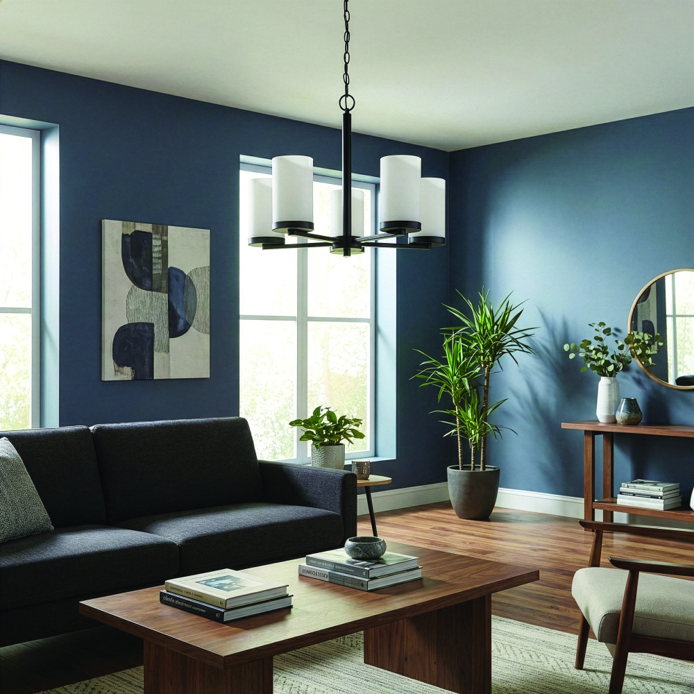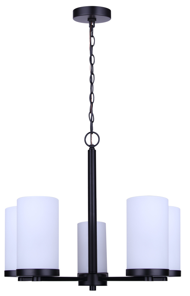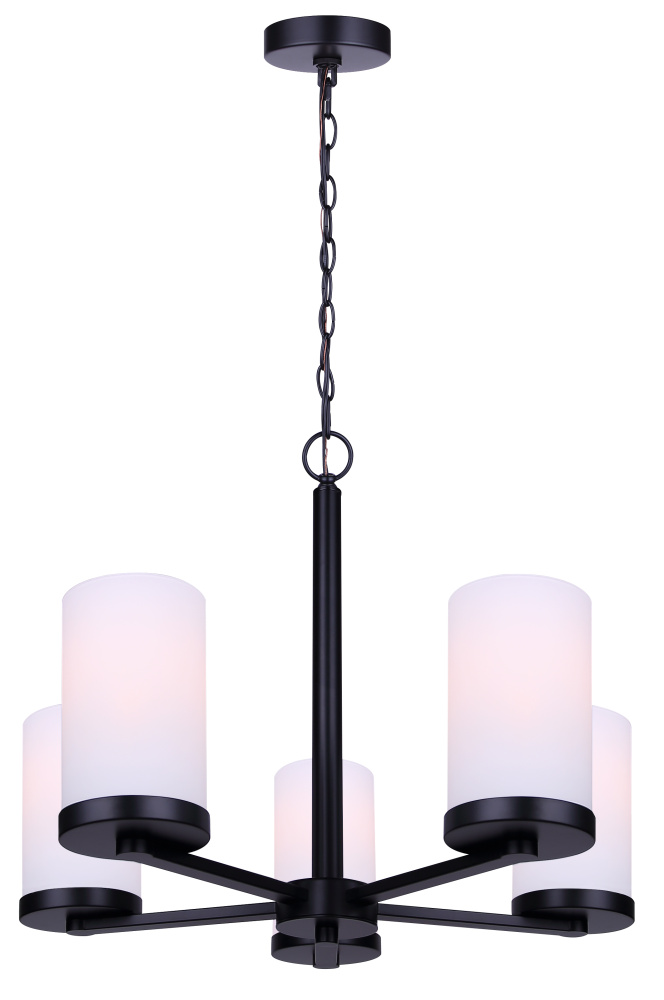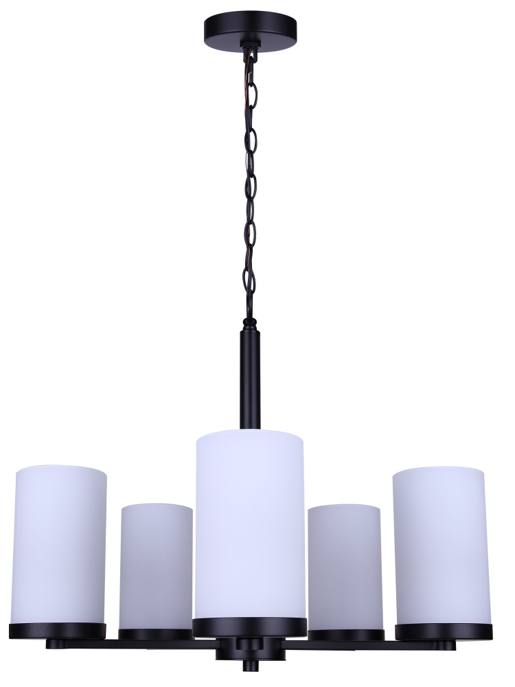 The BRITTON 5-light chain chandelier in matte black brings an effortless blend of refined minimalism and timeless style to your home. With its modern matte black finish and flat opal glass shades, this fixture complements both transitional and contemporary interiors, offering a bright, elegant focal point for any room. Measuring 21 inches wide and adjustable from 18.12 to 66 inches, this chandelier adapts to a variety of spaces and ceiling heights. The five-light design ensures ample illumination, while the open glass shades create a warm, inviting glow. Compatible with five 60W Type A bulbs, it’s perfect for dining rooms, kitchens, and entryways. Whether you're updating your decor or completing a renovation, BRITTON offers a timeless statement with modern appeal.