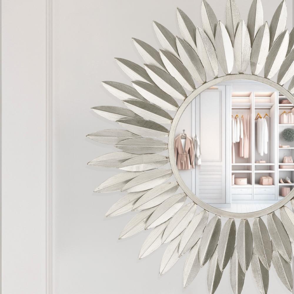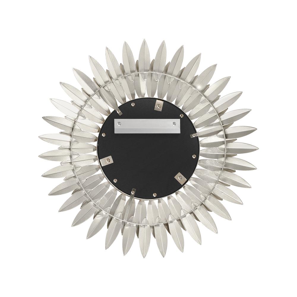 Inspired by Crystorama’s iconic Broche Collection, this stunning mirror brings sculptural artistry to wall décor. The mirror features a radiant sunburst design with hand-forged metal leaves arranged to evoke elegance and organic beauty. The intricate leaf-shaped detailing channels a refined sense of nature-inspired aesthetics, adding warmth and charm to any interior. This mirror is ideal as a focal point in entryways, living rooms, or bedrooms, and it pairs beautifully with contemporary and classic design styles.