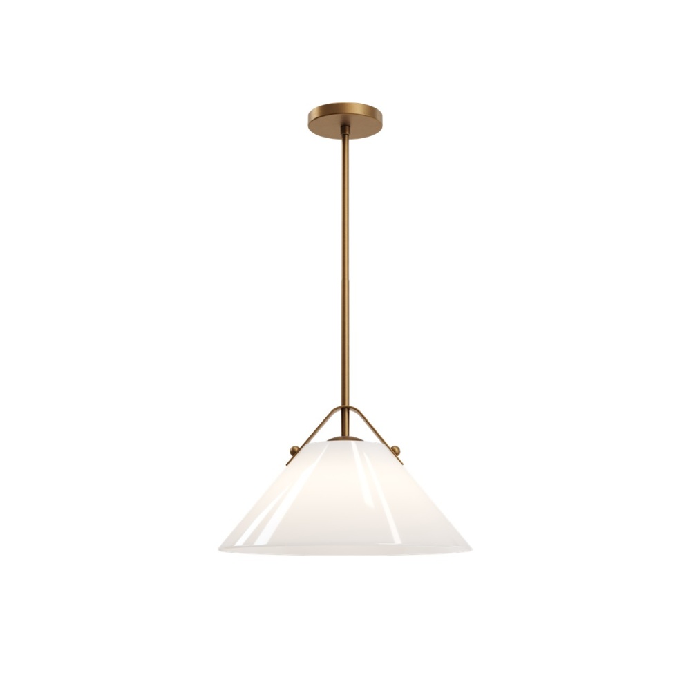 The Bronwen Brass Pendant is an equestrian-inspired design with a flaring white glass shade fastened to the round canopy with a sophisticated strap—a subtle nod to classic tack hardware. The profile can lean modern farmhouse, though it also complements other design styles. The metal in an antique brass finish is a nice contrast to the paleness of the shade, which has a glossy surface that glows. At 19 inches in diameter, the one-light pendant is dimmable. Adjustable from 18" to 60" with use of included chain/rod kit/cable. If your space calls for a longer drop, additional chain/rods/cable is available for purchase.