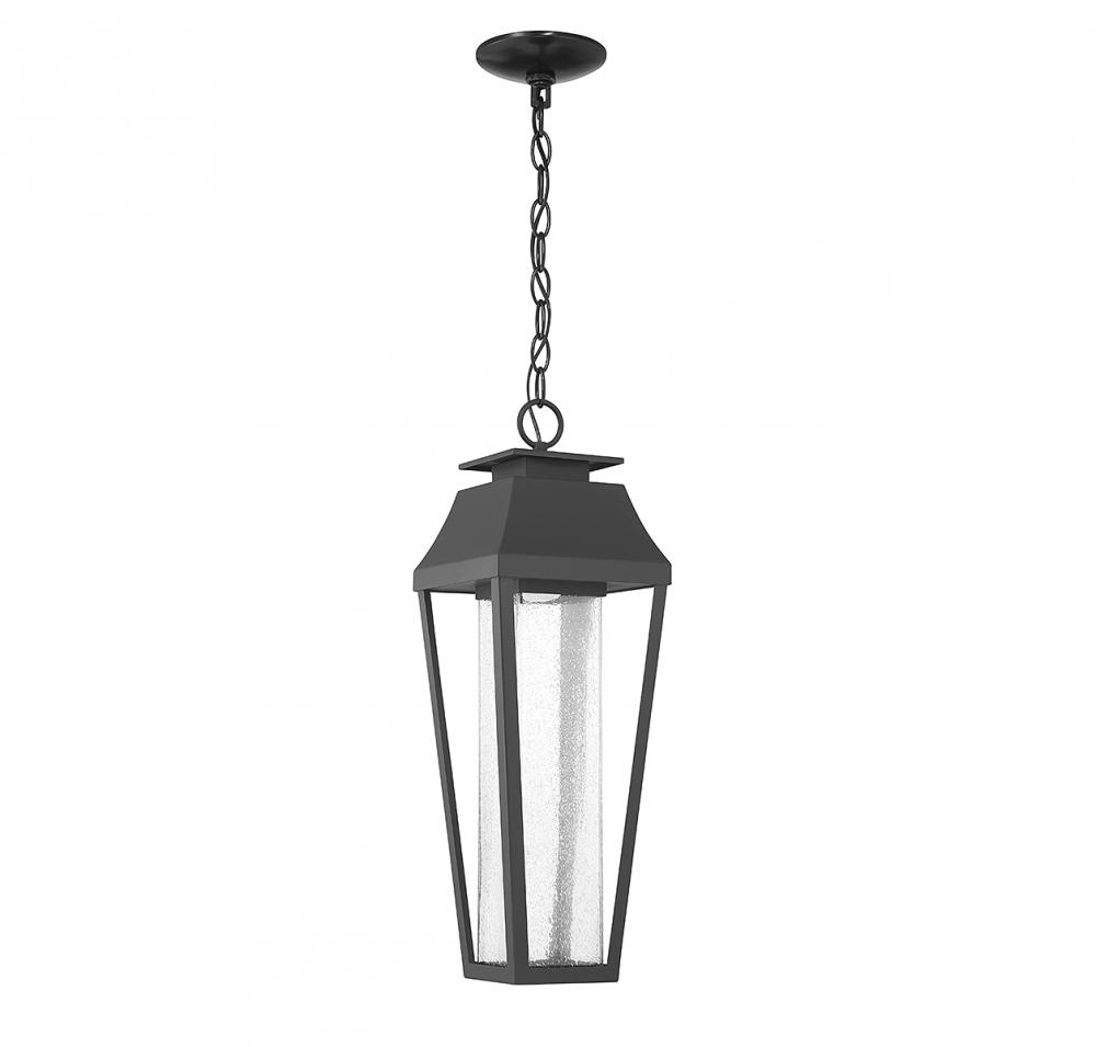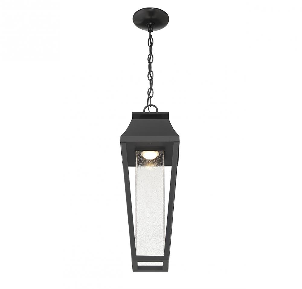 From Savoy House, the Brookline 1-light outdoor hanging light showcases a more contemporary take on classic lantern-style illumination with a central column of clear seeded glass illuminated by integrated LED light. The matte black finish adds versatility. Brookline is 21.75" in height and 7.25" in width.