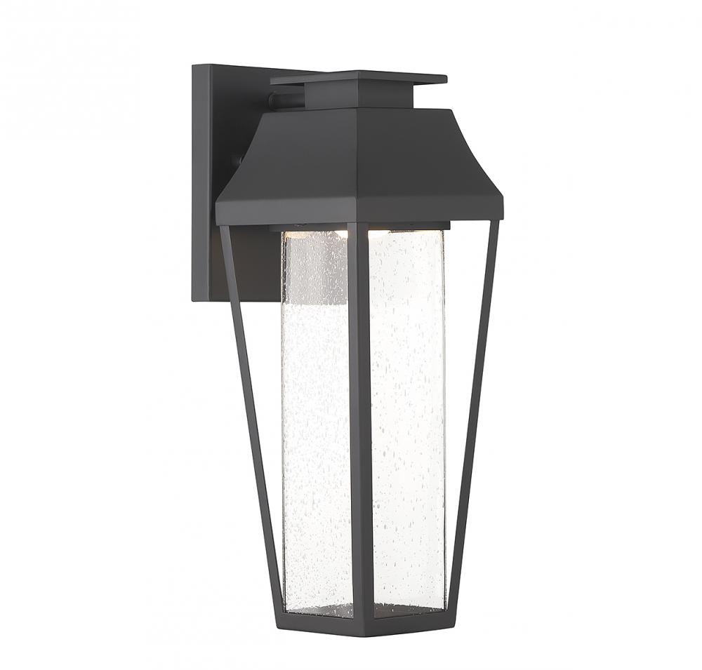 From Savoy House, the Brookline 1-light outdoor wall light showcases a more contemporary take on classic lantern-style illumination with a central column of clear seeded glass illuminated by integrated LED light. The matte black finish adds versatility. Brookline is 15" in height, 5.5" in width and extends 6.75" from the wall.