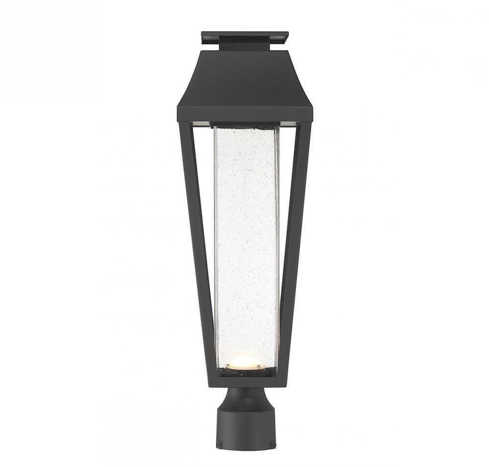 From Savoy House, the Brookline 1-light outdoor post light showcases a more contemporary take on classic lantern-style illumination with a central column of clear seeded glass illuminated by integrated LED light. The matte black finish adds versatility. Brookline is 22.5" in height and 7.25" in width.