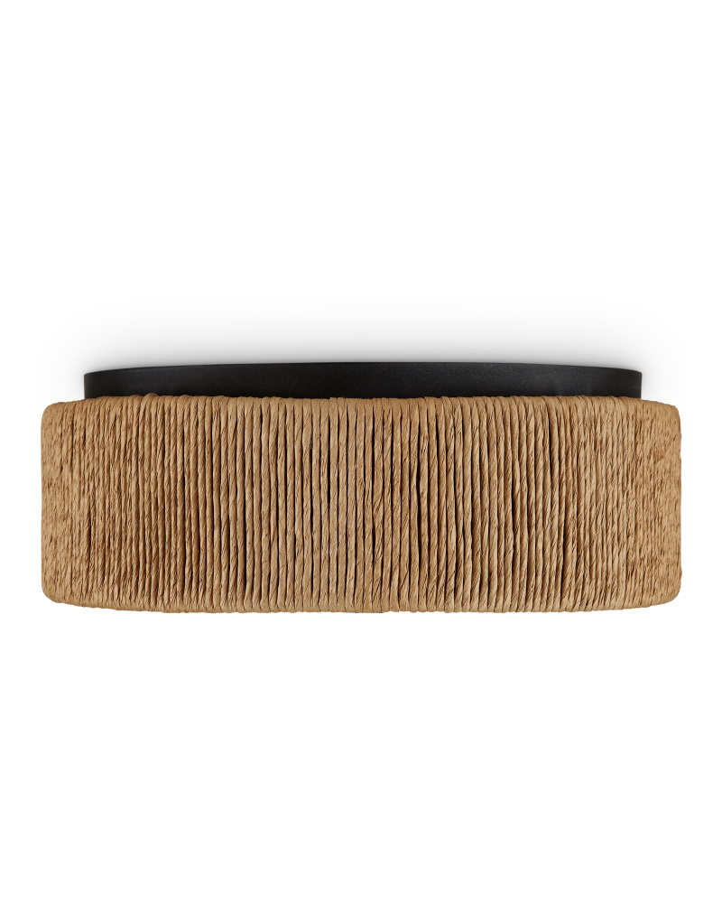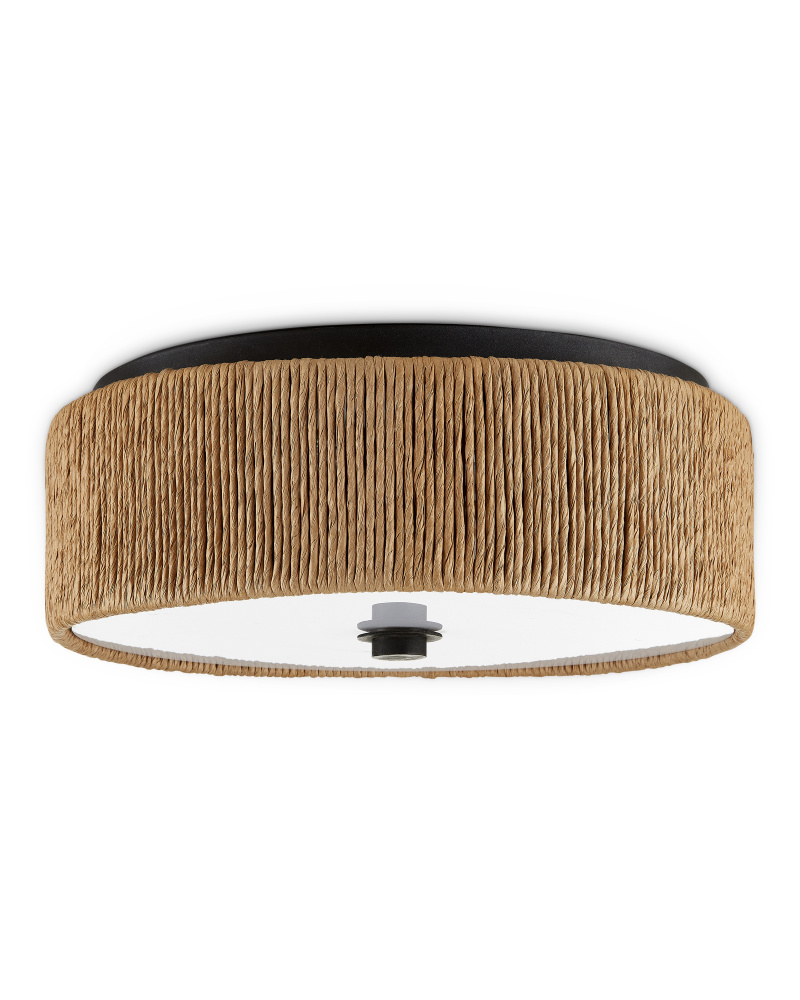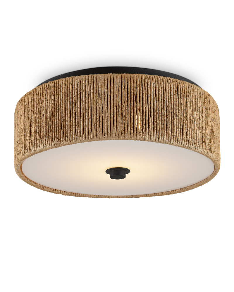 The Brownell Flush Mount has a mix of warmth and brightness. The warmer tones are created by the Kraft paper twine woven around its circumference, and the blacksmith finish on the metal that mounts it to the ceiling and the finial that fastens the acrylic diffuser to the bottom. The diffuser will create an even glow when light wafts through it. The pale, sleek material is the contrasting element to this design.