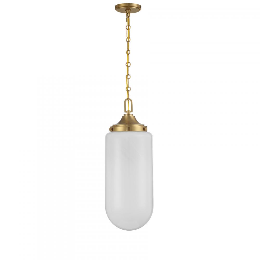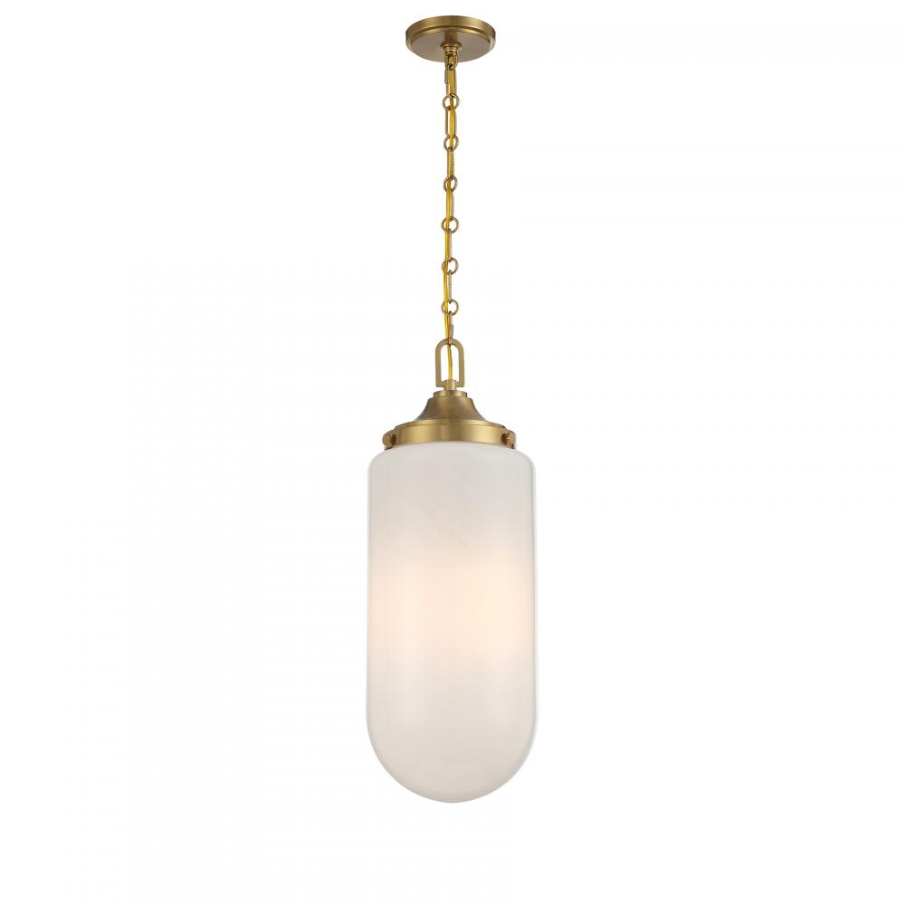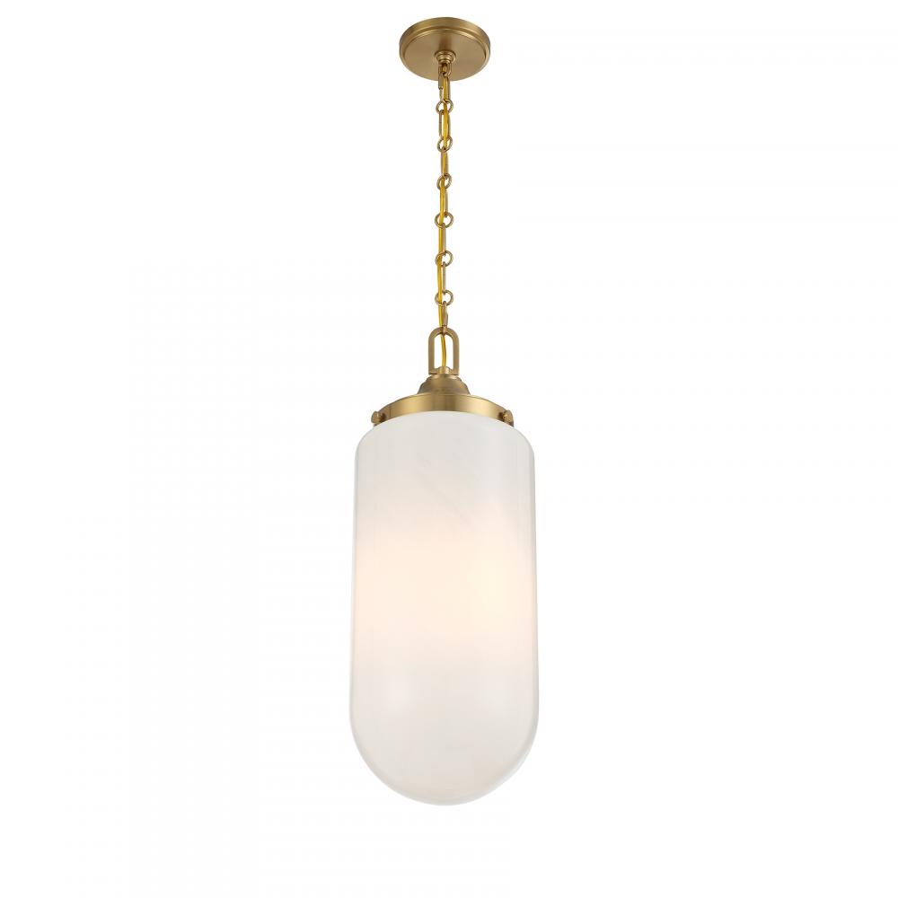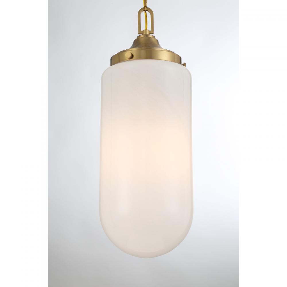 Decorate your space with the Savoy House Bryant 3-light pendant. Its understated structure allows the shade of beautiful, eye-catching strie glass to take center stage. This look is great when used solo or in groupings. Warm Brass finish. 24.75" in height and 9" in width. Uses three standard size bulbs of up to 60 watts per bulb. Bulbs not included.