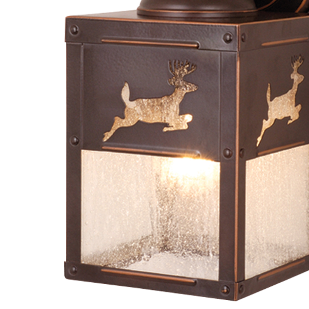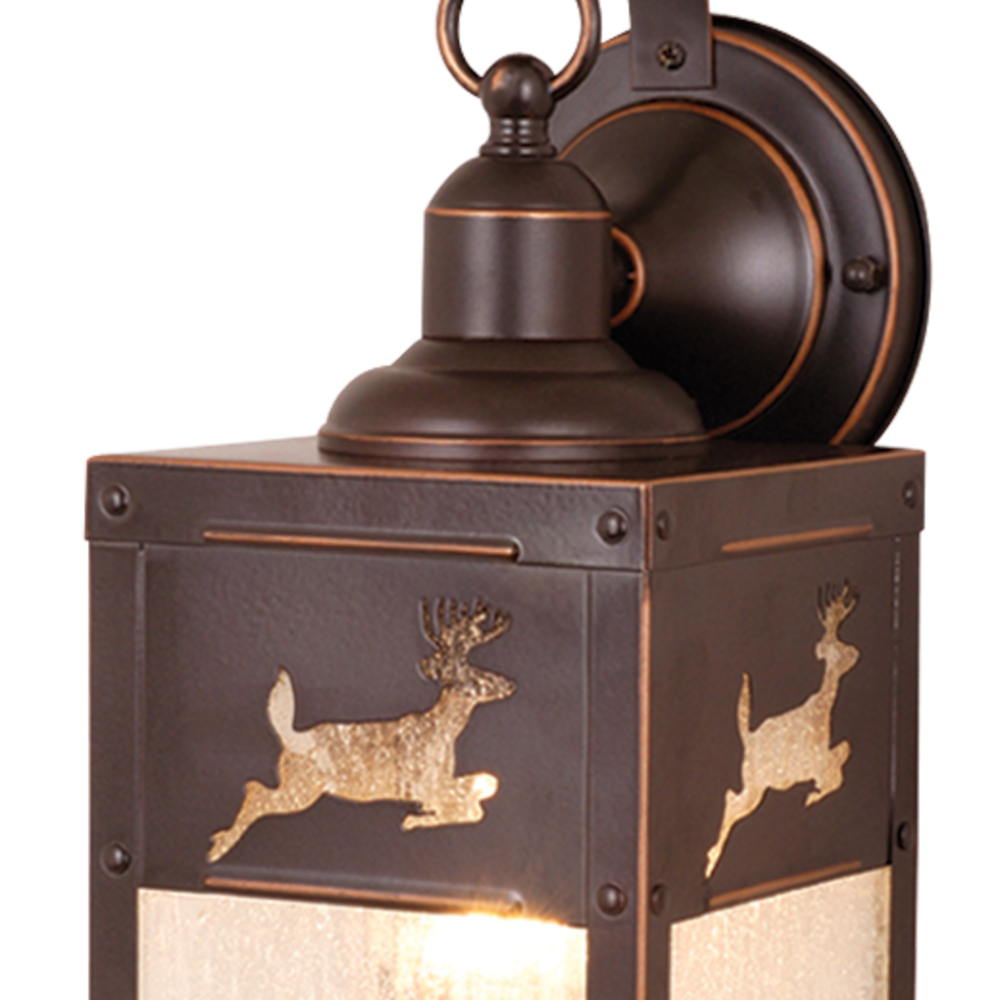 Evoking the spirit of the wilderness, this rustic themed light is clad in a burnished bronze finish and features silhouetted deer imagery atop glowing white tiffany style glass. The classic form of this lamp makes it a great choice for a vacation lodge, cabin or a suburban home - it will complement a variety of home styles: anywhere you want to bring an element of nature. Medium screw base lamping provides maximum light output, and flexibility in bulb choice.