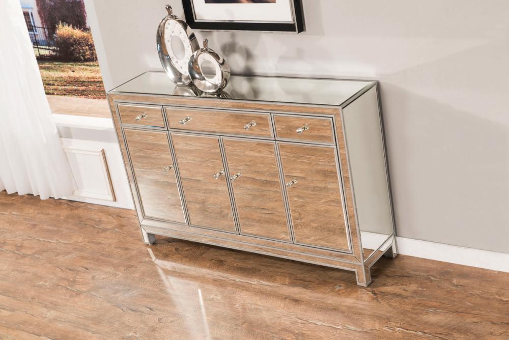 In bold symmetry, measuring W56xD13xH36”, this contemporary piece can decorate any narrow hallway or dinning room and still yield plenty of storage space. With the gleaming beveled mirror surfaces, it opens up the visual space in the room while imbuing it with glamour. The crystal door knobs exude sheer elegance. FEATURES: *Reflexion collection *3 drawers and 4 doors * crystal knobs *Hand paintedSilver finish *Beveled mirror panel *Solid wood trim and legs *Wood drawer glides *Inside lining painted in silver. PRODUCT DETAILS: Measurement W56xD13xH36” *No assembly required *Material in solid wood and engineered wood * 1 year limited warranty.