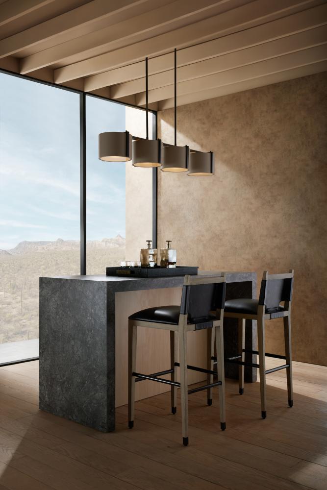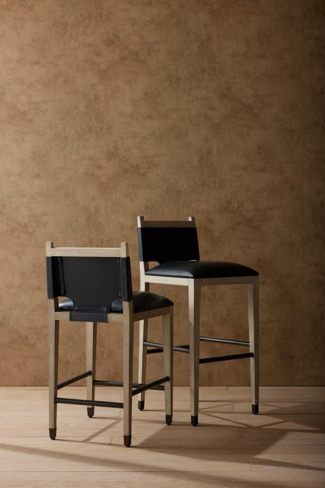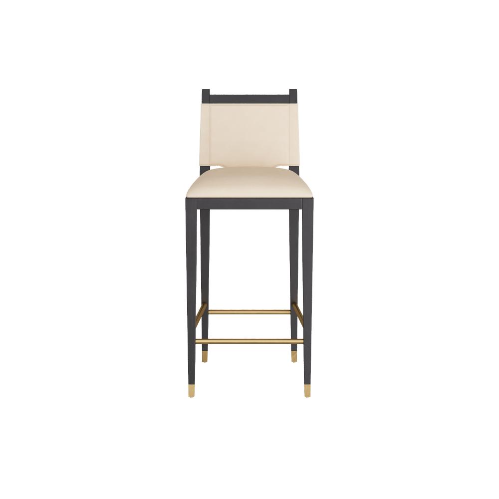 Tapered legs and straight lines lend a masculine appeal to our tailored ebony finished beech wood bar stool. For comfort and style, we wrapped the t-shaped and well-padded seat in ivory leather. Finished with non-functional snap details and tipped at each leg with antique brass sabots. Leather will vary.