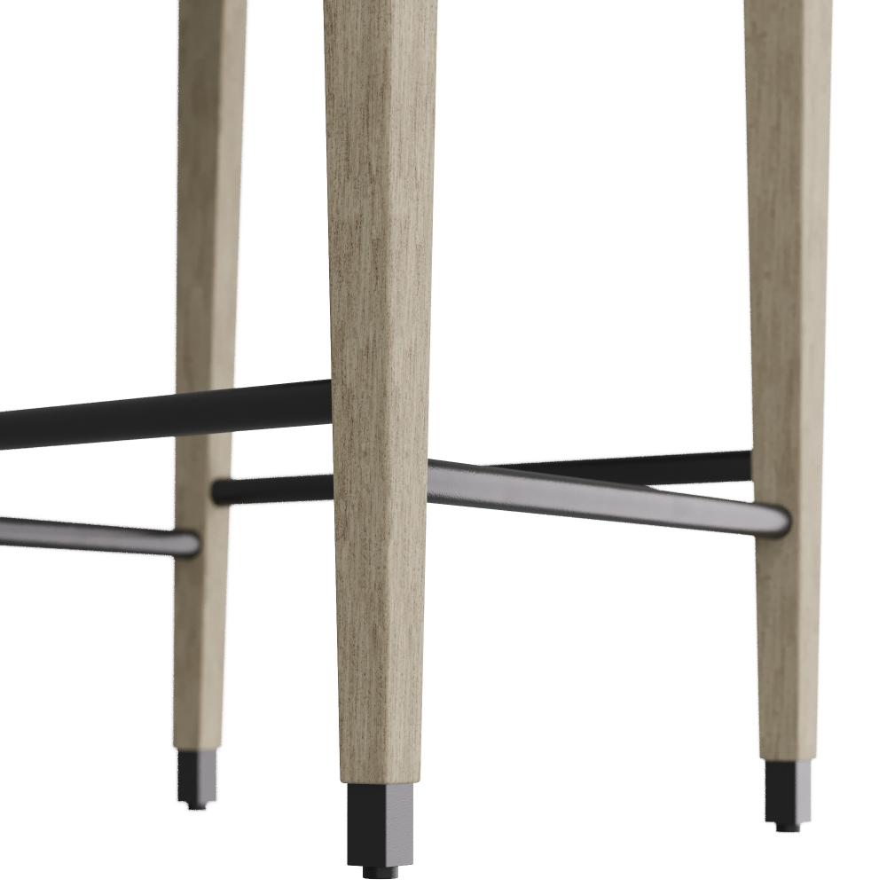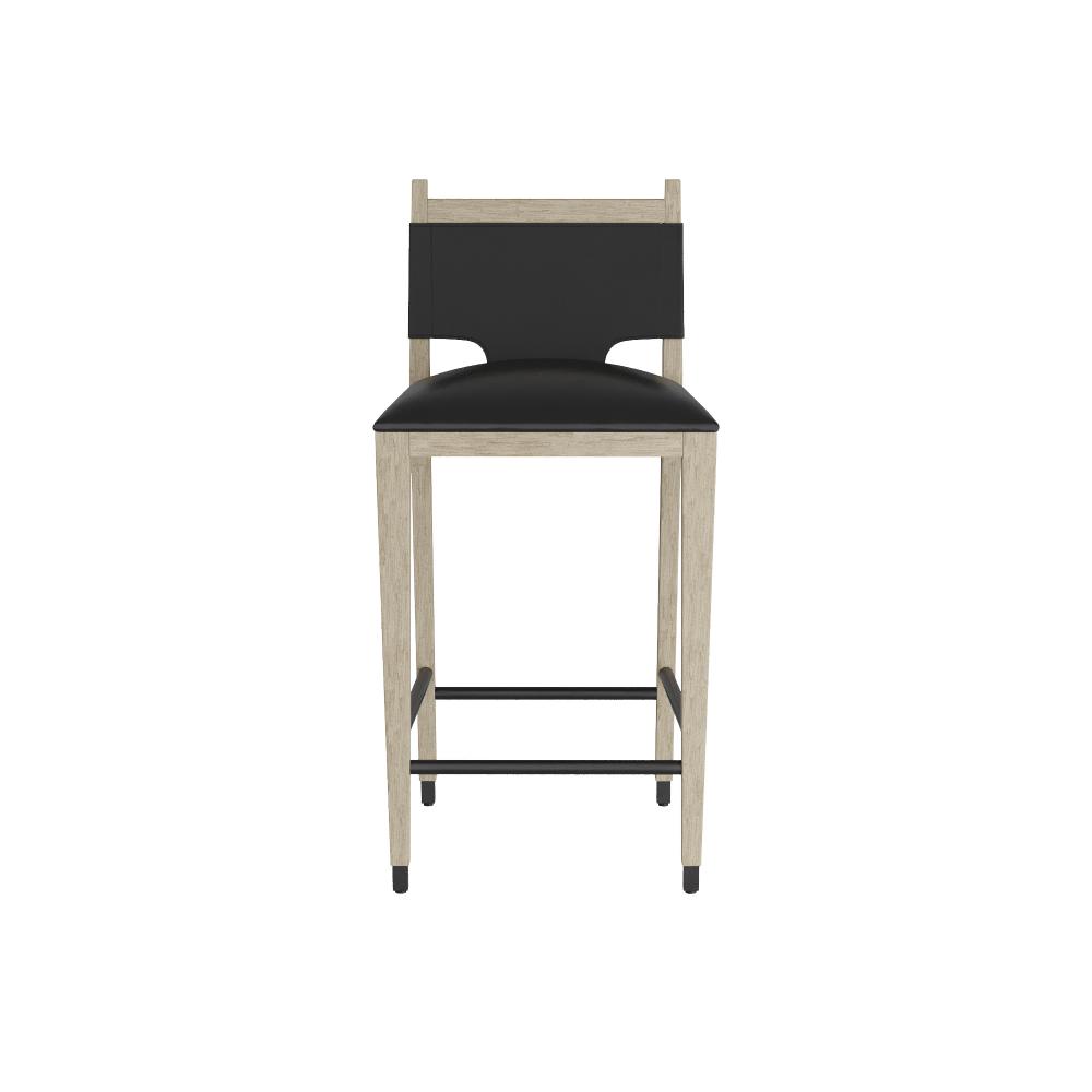 Tapered legs and straight lines lend a masculine appeal to our tailored smoke finished beech wood bar stool. For comfort and style, we wrapped the t-shaped and well-padded seat in ebony leather. Finished with non-functional snap details and tipped at each leg with bronze sabots. Leather will vary.