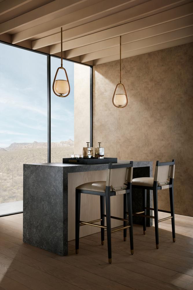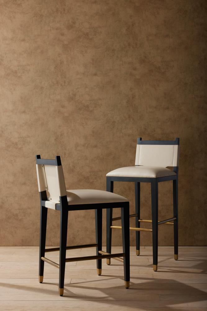Tapered legs and straight lines lend a masculine appeal to our tailored ebony finished beech wood counter stool. For comfort and style, we wrapped the t-shaped and well-padded seat in ivory leather. Finished with non-functional snap details and tipped at each leg with antique brass sabots. Leather will vary.