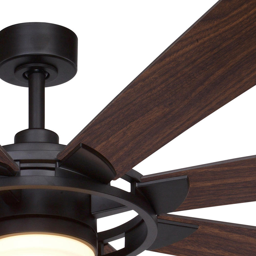 Do not let the simplicity of the Burlington ceiling fan fool you! The Burlington offers an understated farmhouse look to any home. A new bronze finish and frosted white integrated light adds a flavor of old world charm. Switch up your look with the eight reversible blades of driftwood or walnut colors. An integrated LED light source provides energy saving, no bulb changing convenience, low maintenance and long-lasting performance. Remote control included, height adjustable with longer downrod (sold separately), sloped ceiling compatible. At 68 inches, this large windmill style ceiling fan is ideal for great rooms, vaulted ceilings, or any other living space.