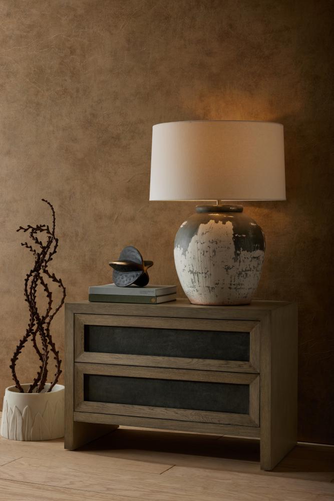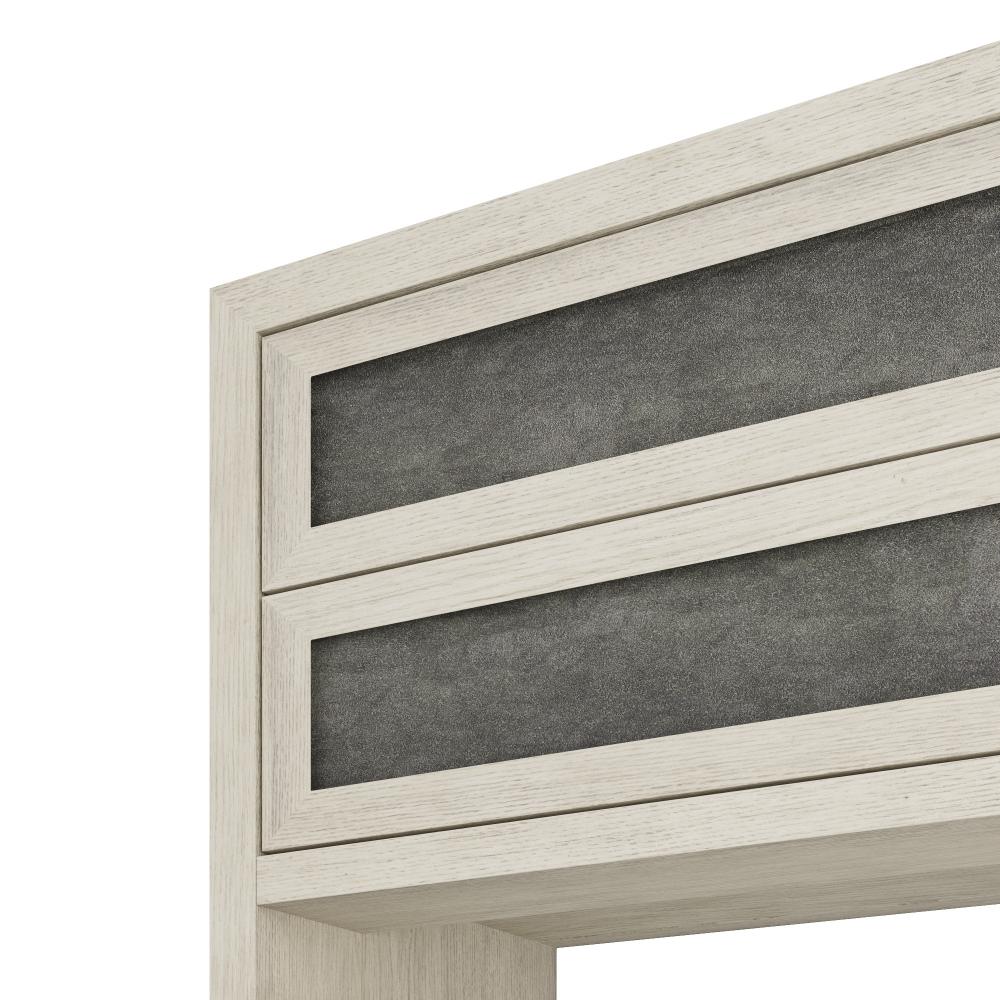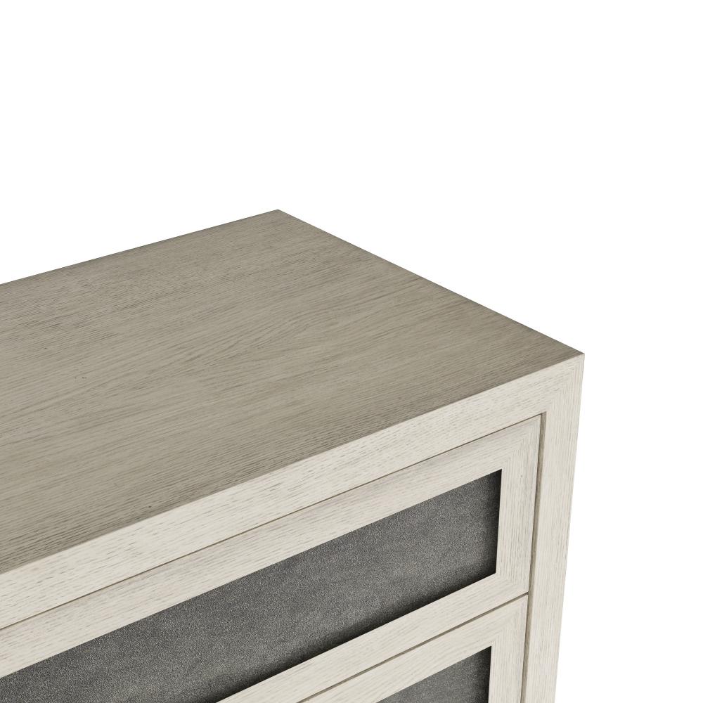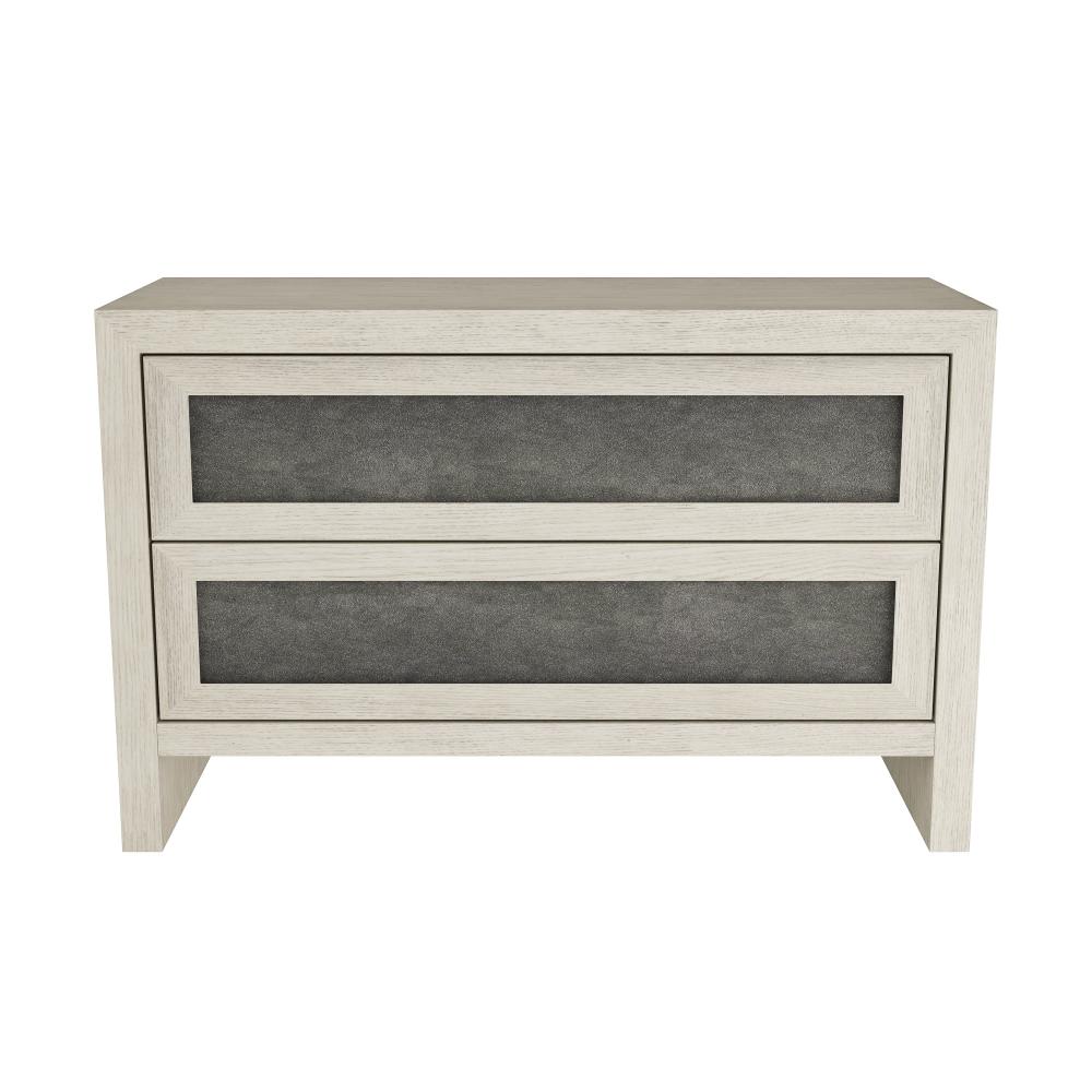 Evoking the clean lines of contemporary furnishings, the Burnett side table is both understated and essential. Its solid, smoke-finished wood frame is accented with panels of soft graphite suede for textural interest. Both drawers are lined in matching suede for sophisticated refinement. Suede and wood will vary.