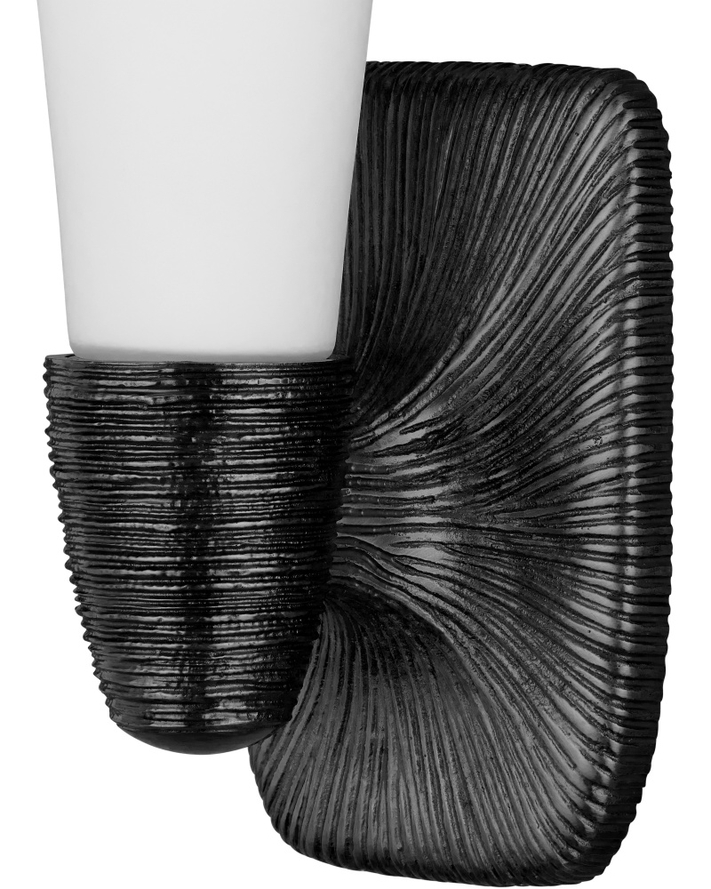The Burrows Brass Bath Wall Sconce is made of cast brass with tremendous texture on its metal surfaces that resemble flowing strands of hair pulled tightly into a bun. The white glass globes that extend above and below the wallplate form an hour-glass shape that contrasts the metal in an antique brass finish. The two-light sconce, which is 24 inches tall, is dimmable and damp rated.