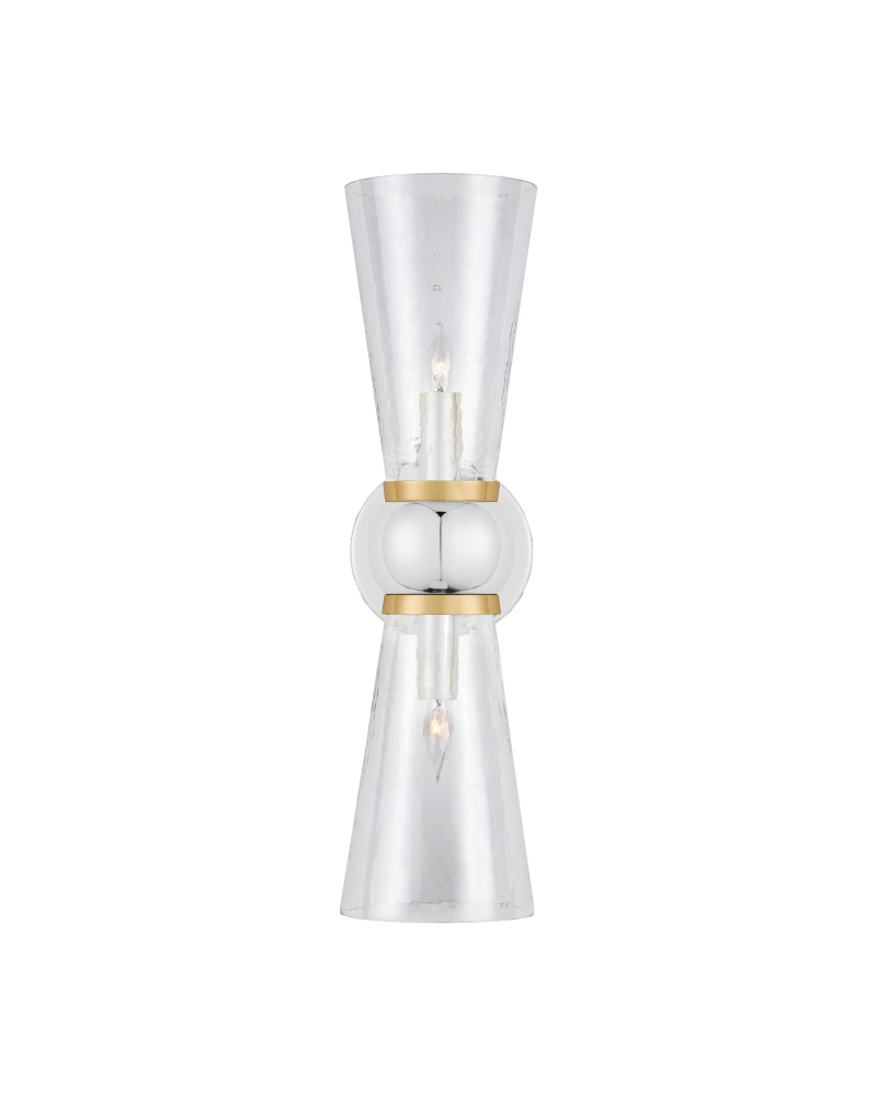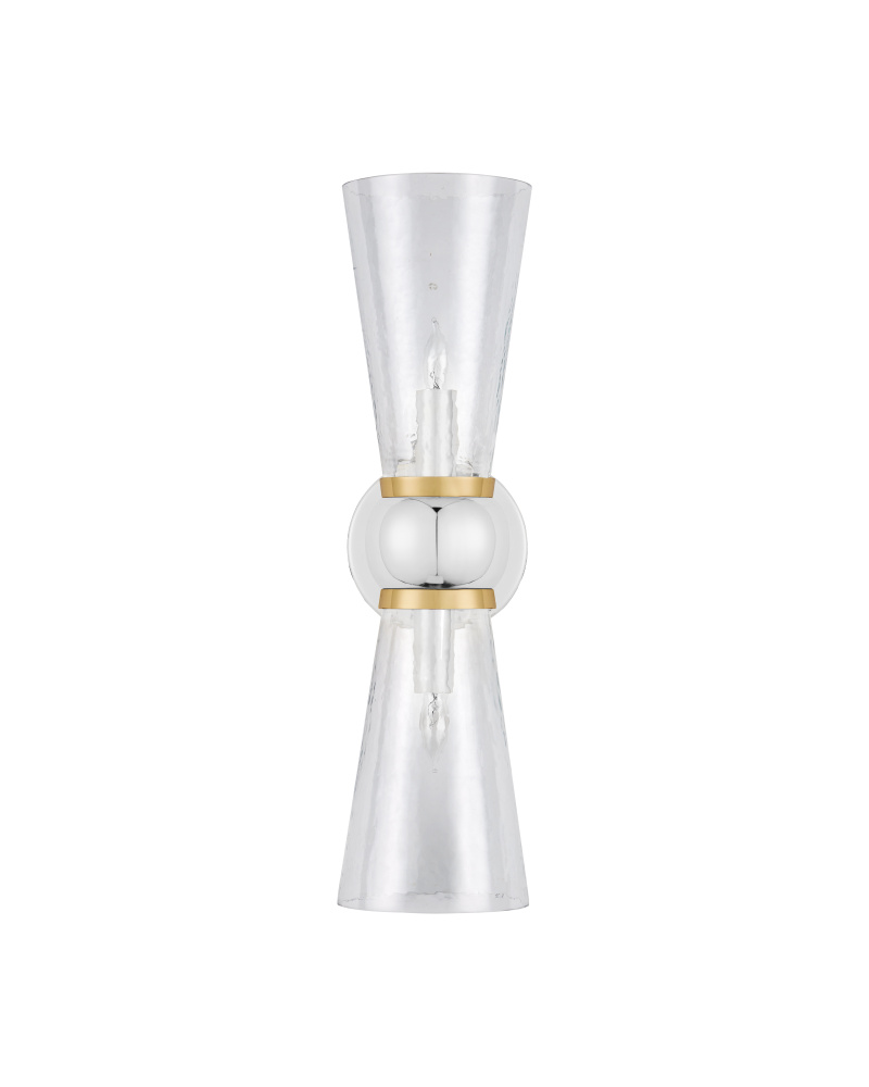 The conical glass cones on the Byford Nickel Bath Wall Sconce create a soft, diffused glow, perfect for bringing a cozy ambience to any bathroom. The bath sconce is made of brass in a polished nickel finish, and the glass diffusers have a hammered texture to them. These are stylish sconces for lighting up a bathroom vanity or a powder room.