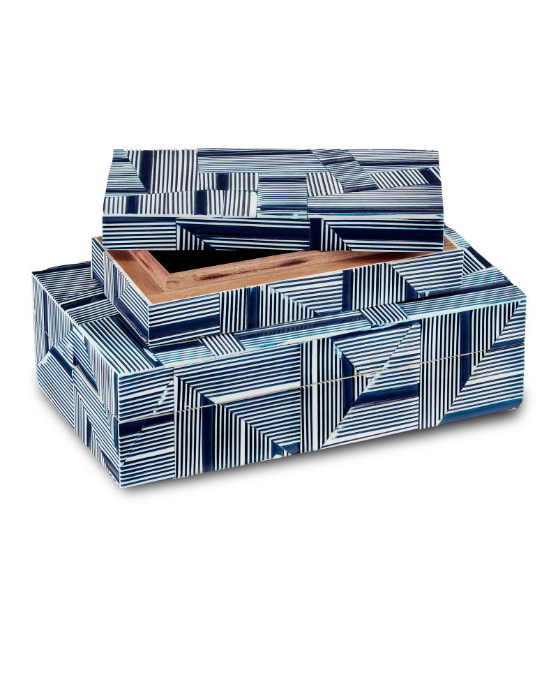 With bold patterns that match on all sides, the Cade Blue Box Set includes two nesting boxes that are made of solid wood covered in composite in blue and white patterns. The intermingling of thin and thick delineations creates a telescoping effect that brings the surfaces of these boxes the feel that they are in constant movement. The application is a painstaking one.