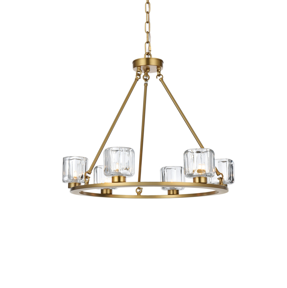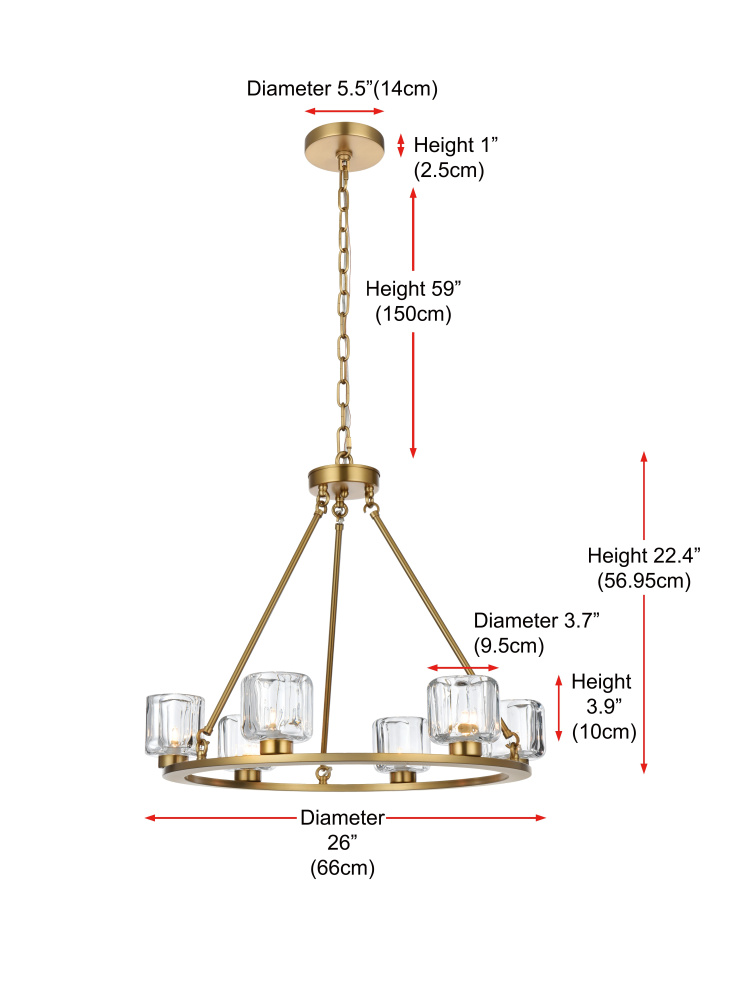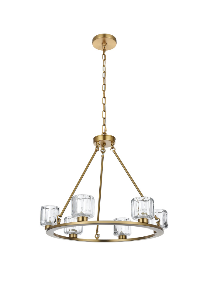 Add modern charm to your space with this striking chandelier, where a sleek circular iron frame meets sculpted clear glass shades. The unique design features decorative hanging rods with hooks, enhancing the structure with industrial flair. The clear glass refracts light beautifully, creating a radiant glow that uplights your space with warmth and dimension. Perfect for dining rooms, living rooms, or offices, this chandelier is available in black for a bold contrast, satin gold for a luxurious touch, and chrome for a sleek, modern vibe. With multiple size options and a matching canopy and chain for seamless installation, this dimmable chandelier offers both beauty and versatility. Light bulbs are not included, allowing you to choose the perfect style to match your vision.