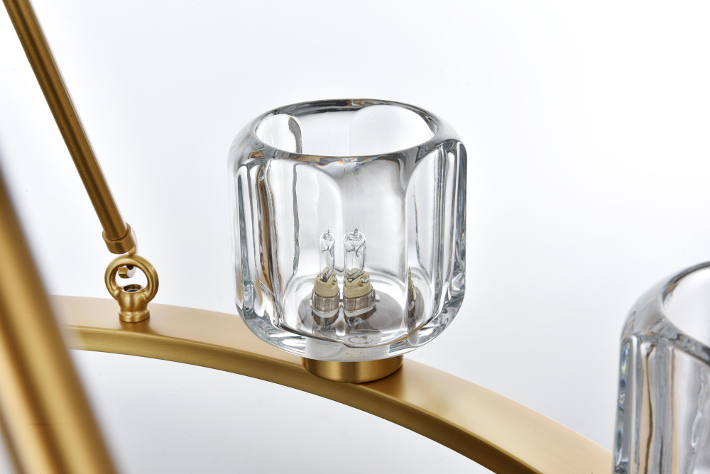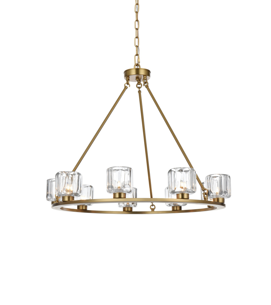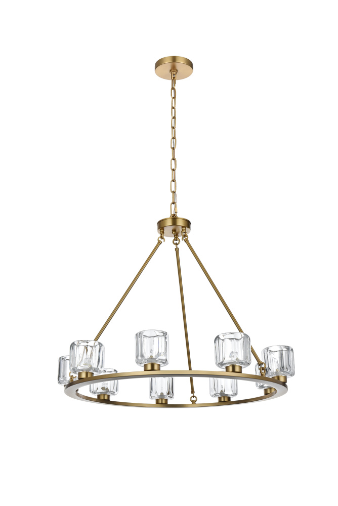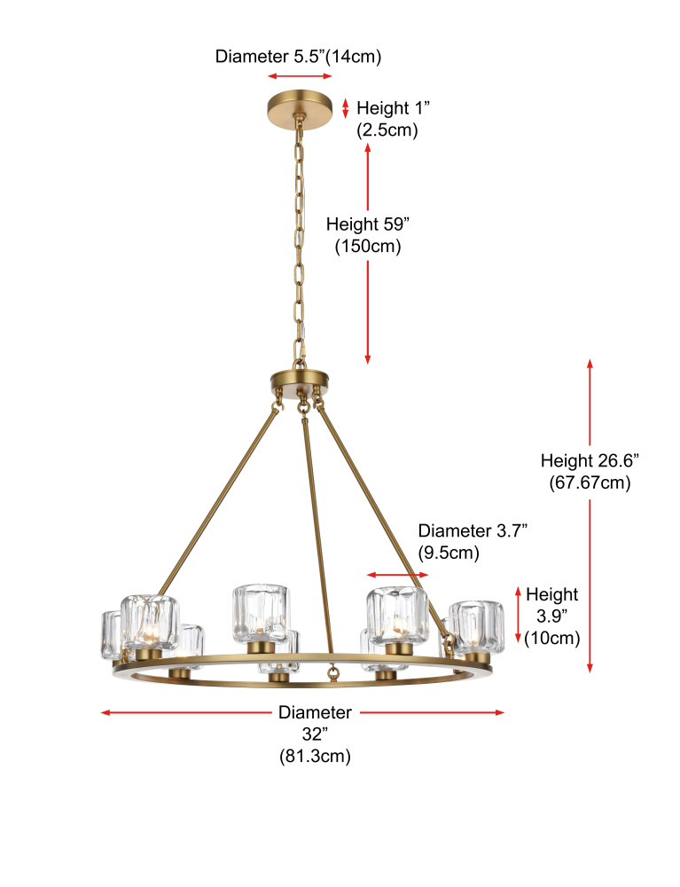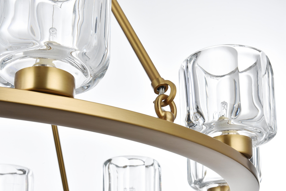 Add modern charm to your space with this striking chandelier, where a sleek circular iron frame meets sculpted clear glass shades. The unique design features decorative hanging rods with hooks, enhancing the structure with industrial flair. The clear glass refracts light beautifully, creating a radiant glow that uplights your space with warmth and dimension. Perfect for dining rooms, living rooms, or offices, this chandelier is available in black for a bold contrast, satin gold for a luxurious touch, and chrome for a sleek, modern vibe. With multiple size options and a matching canopy and chain for seamless installation, this dimmable chandelier offers both beauty and versatility. Light bulbs are not included, allowing you to choose the perfect style to match your vision.
