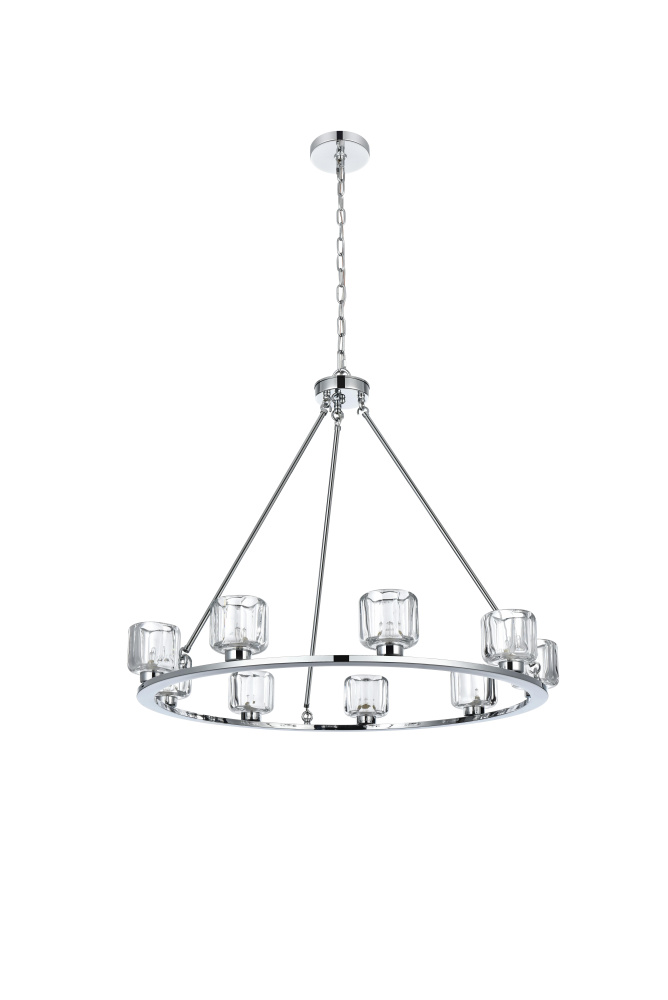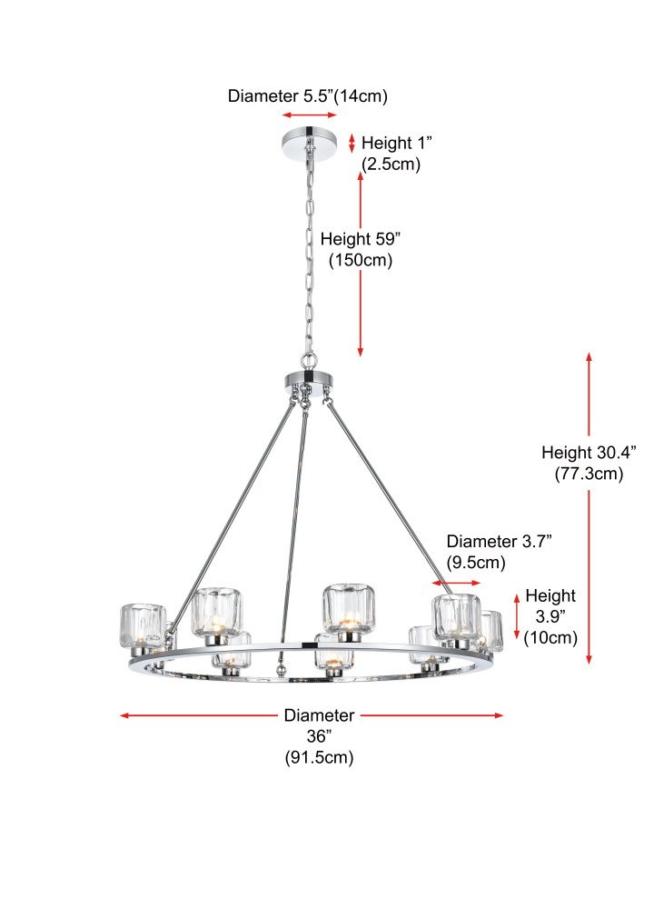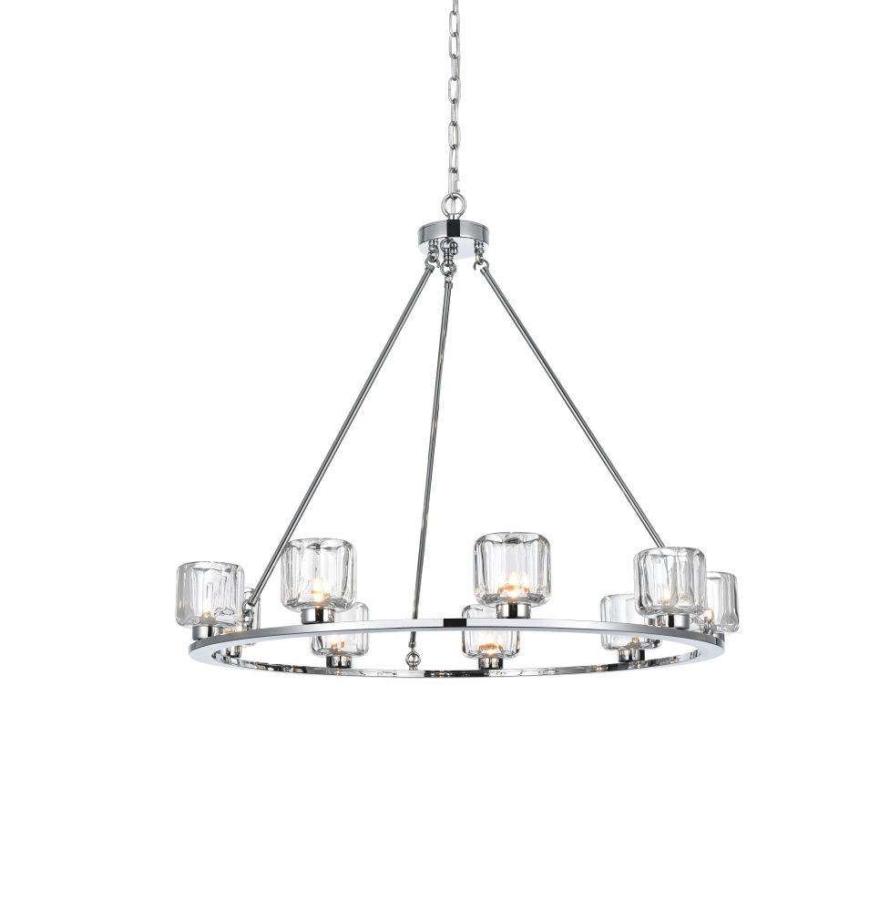 Add modern charm to your space with this striking chandelier, where a sleek circular iron frame meets sculpted clear glass shades. The unique design features decorative hanging rods with hooks, enhancing the structure with industrial flair. The clear glass refracts light beautifully, creating a radiant glow that uplights your space with warmth and dimension. Perfect for dining rooms, living rooms, or offices, this chandelier is available in black for a bold contrast, satin gold for a luxurious touch, and chrome for a sleek, modern vibe. With multiple size options and a matching canopy and chain for seamless installation, this dimmable chandelier offers both beauty and versatility. Light bulbs are not included, allowing you to choose the perfect style to match your vision.