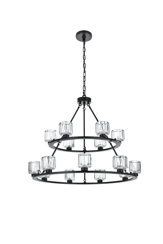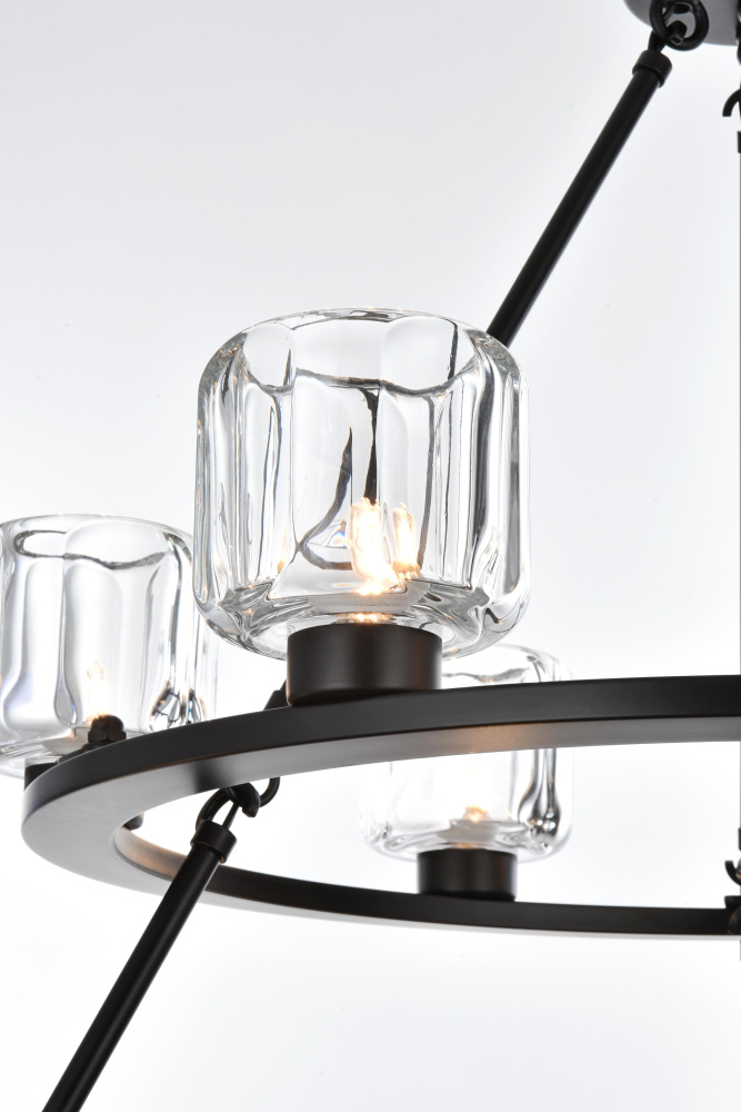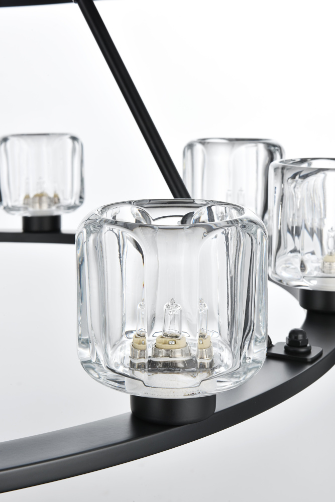 Add modern charm to your space with this striking chandelier, where a sleek circular iron frame meets sculpted clear glass shades. The unique design features decorative hanging rods with hooks, enhancing the structure with industrial flair. The clear glass refracts light beautifully, creating a radiant glow that uplights your space with warmth and dimension. Perfect for dining rooms, living rooms, or offices, this chandelier is available in black for a bold contrast, satin gold for a luxurious touch, and chrome for a sleek, modern vibe. With multiple size options and a matching canopy and chain for seamless installation, this dimmable chandelier offers both beauty and versatility. Light bulbs are not included, allowing you to choose the perfect style to match your vision.