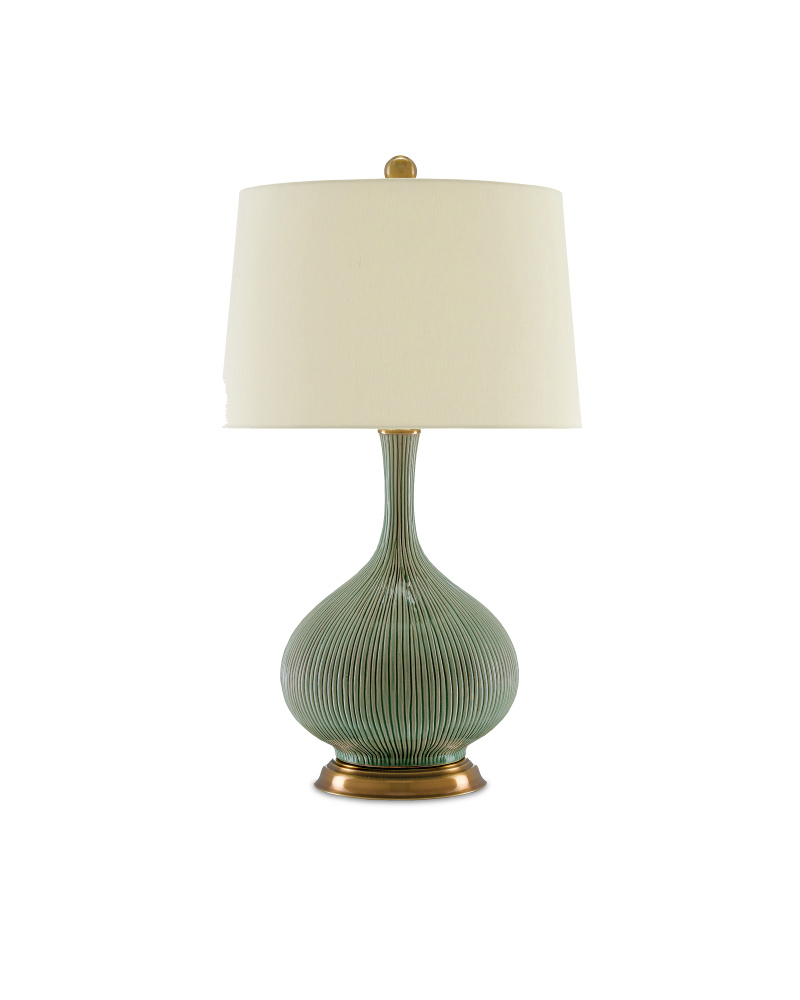 The vase-like body of the Cait Table Lamp is made of striated ceramic in a lovely textural grass green. The paleness of this subtle hue is contrasted by the antique brass finish on the base, the hardware, and the orb-like finial. This green lamp is topped with a tan sand linen shade.