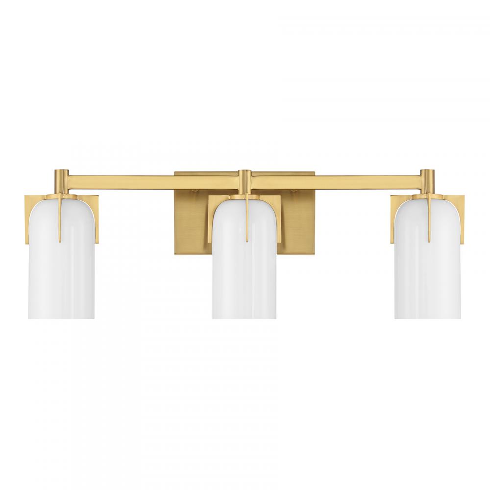 Bring fashionable, vintage-inspired lighting home with the Savoy House Caldwell 3-light bath bar. Etched white opal glass shades are held in place with dramatic jewelry-like prongs that are finished in Warm Brass. Caldwell is 8.5" in height, 24" in width and extends 5.5" from the wall. It uses three candelabra size bulbs of up to 60 watts per bulb. Bulbs not included. This bath light is damp area rated and must be installed as shown.