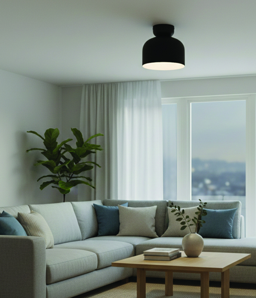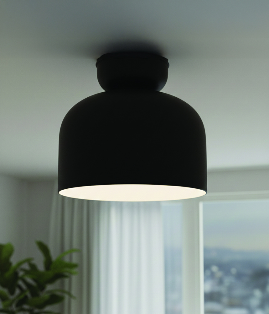 The CALEB 1-light flush mount in matte black is a bold statement in modern minimalism, designed for those who choose their lighting with intention. Its all-black finish embodies modern luxe while the crisp white interior of the shade enhances illumination through maximum light reflection. Compact at 9 inches wide by 8.5 inches high, this fixture makes a substantial impact in hallways, bedrooms, or entryways without overwhelming the space. Pairing form and function, it accommodates a single 60W Type A bulb, providing warm and adequate light with a sleek, understated profile. With Easy Connect technology, installation is simple, making the CALEB a purposeful design choice that elevates everyday living.