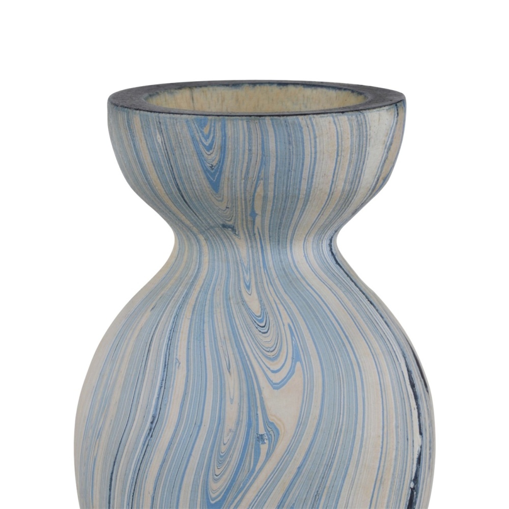 Made of wood, the Calm Sea Marbleized Vase Set includes three white and blue vases with swirling patterns along their surfaces, which have been hand-painted for a marbleized effect. The neutral tones of blue and white bring these pale blue decorative accessories a textural feel. The patterning on these multi-colored vases will make them dynamic elements in a room.