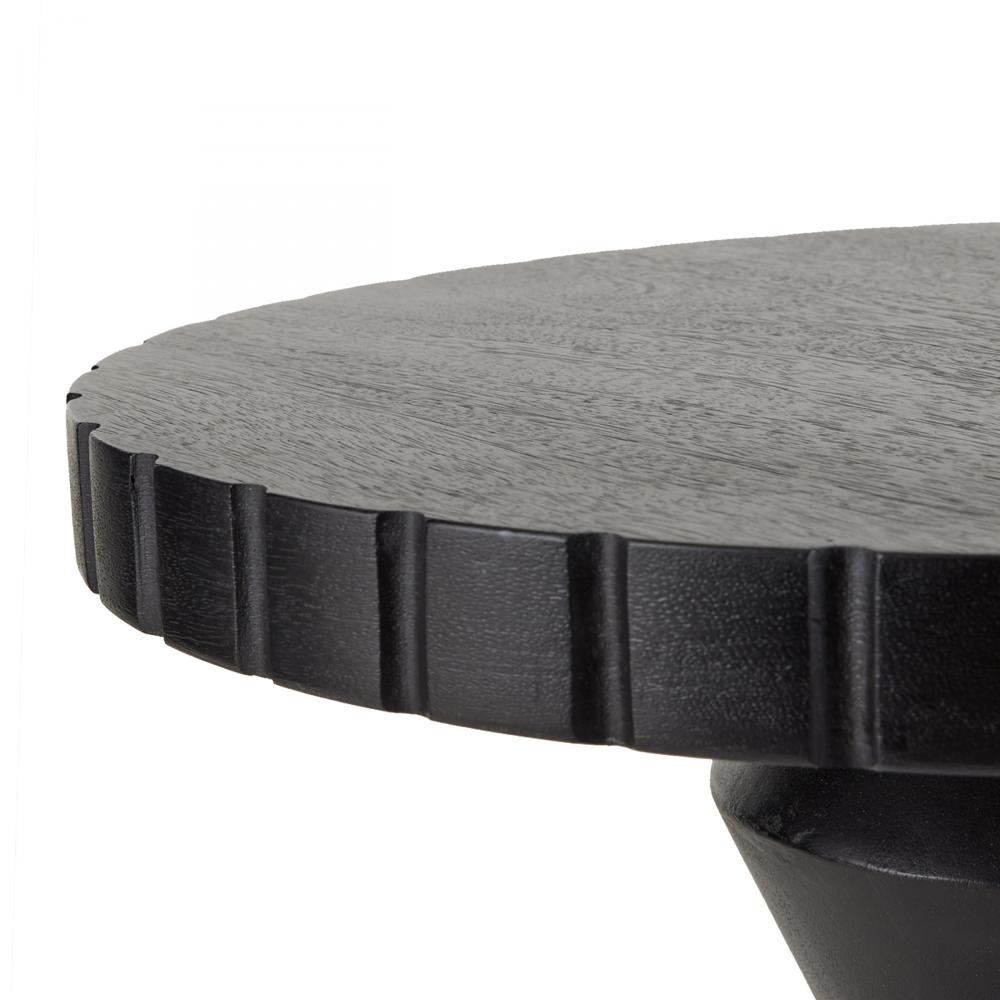 Accented with gear-like etching at the base and top, our machined end table possesses an industrial edge. Carved of ebony mango wood, the bold faceted shape highlights its totemic architecture. Finish will vary.