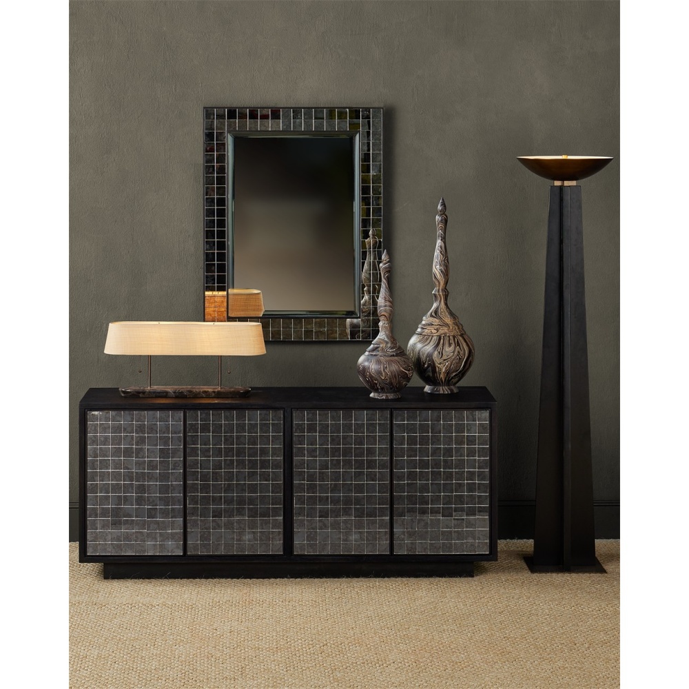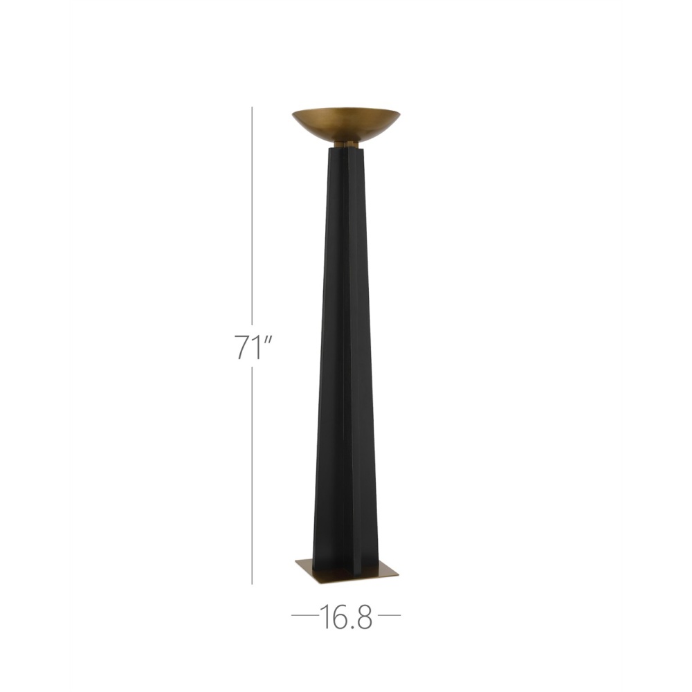 The Calyx Torciere Floor Lamp is made of rubberwood with pitting on its surface that brings patina to the telescoping body. Also contributing to the textural feel is that the black finish has been rubbed away on the edges on the cross-shaped form. The black floor lamp sits on a minimal metal base in an antique brass finish that matches the bowl holding the integrated LED light source.