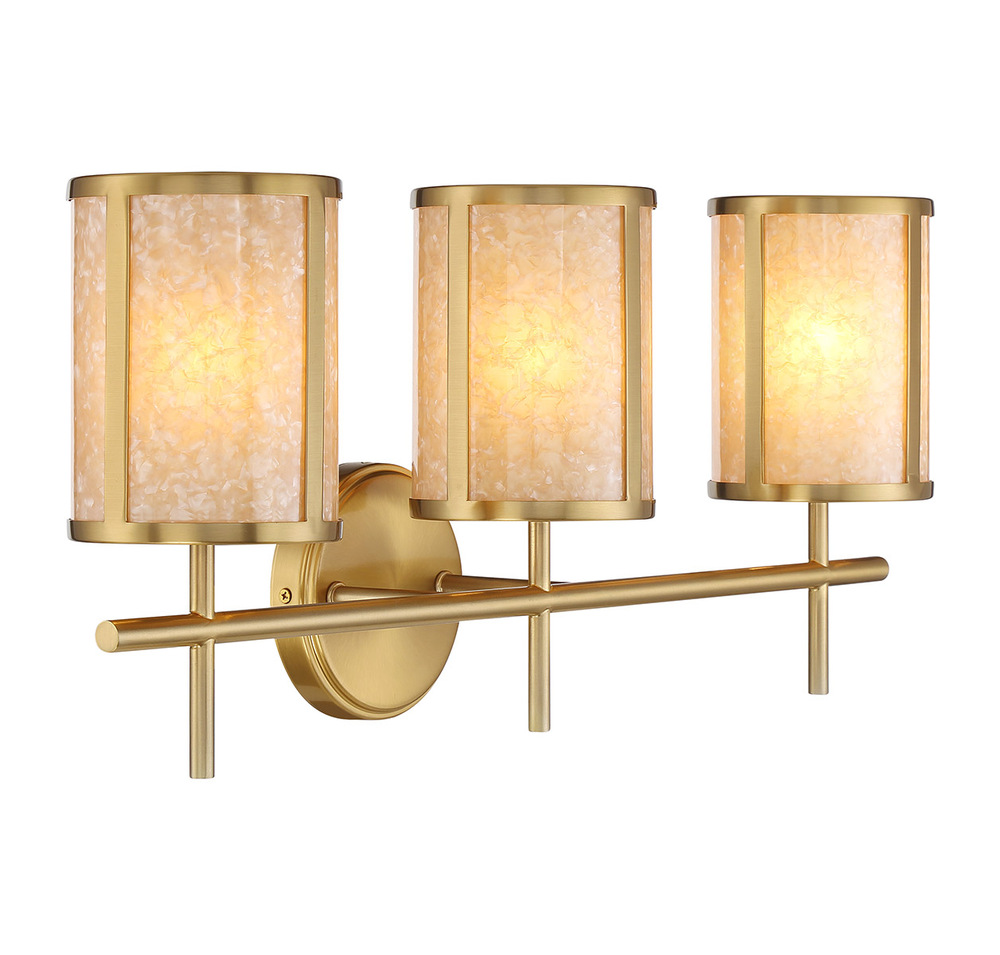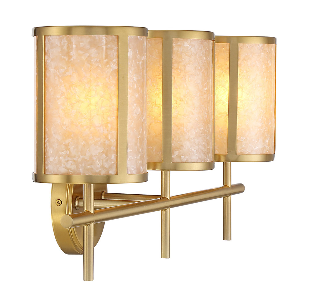 This brilliantly beautiful Savoy House Camden 3-light bath light brings a nature-inspired glow to your vanity. The light shines from within shades adorned with shell accents, their swirling patterns creating another layer of wonder while the Warm Brass finish adds richness. Camden is 10.25" in height, 24" in width and extends 7" from the wall. Uses three candelabra size bulbs of up to 60 watts per bulb. Bulbs not included. This bath light is damp area rated and may be installed with the glass facing up or down.