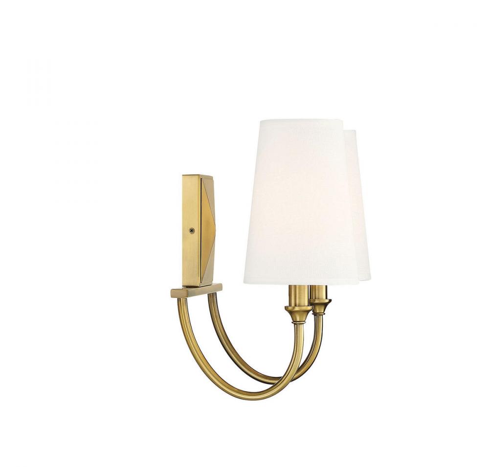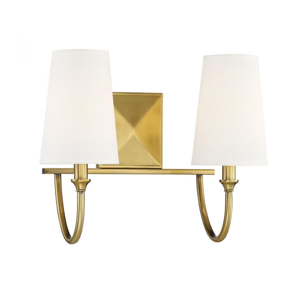 Bring the understated, classic beauty of the Savoy House Cameron 2-light bath bar into your home to create a thoughtful accent in any bathroom. This vanity light features slender, dramatically-curving arms topped with tall, tapered white fabric shades, ensuring a flattering glow. The faceted backplate adds another dimension of style, too. Finished in warm brass. This fixture is 15" wide and 12" tall. It extends 8" from the wall. Uses 2 candelabra size bulbs of up to 40 watts each (not included).