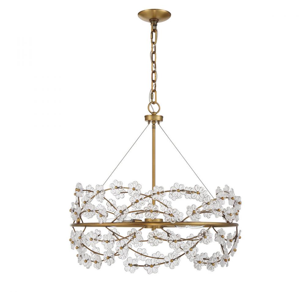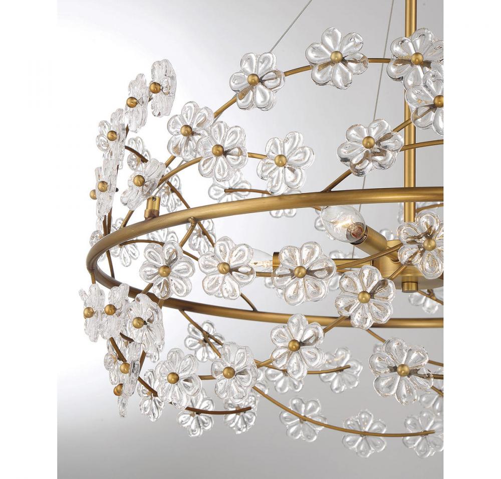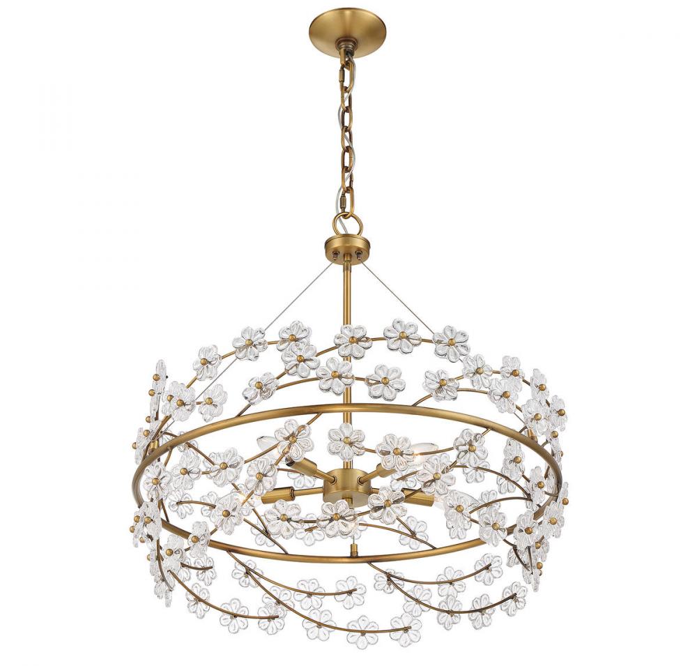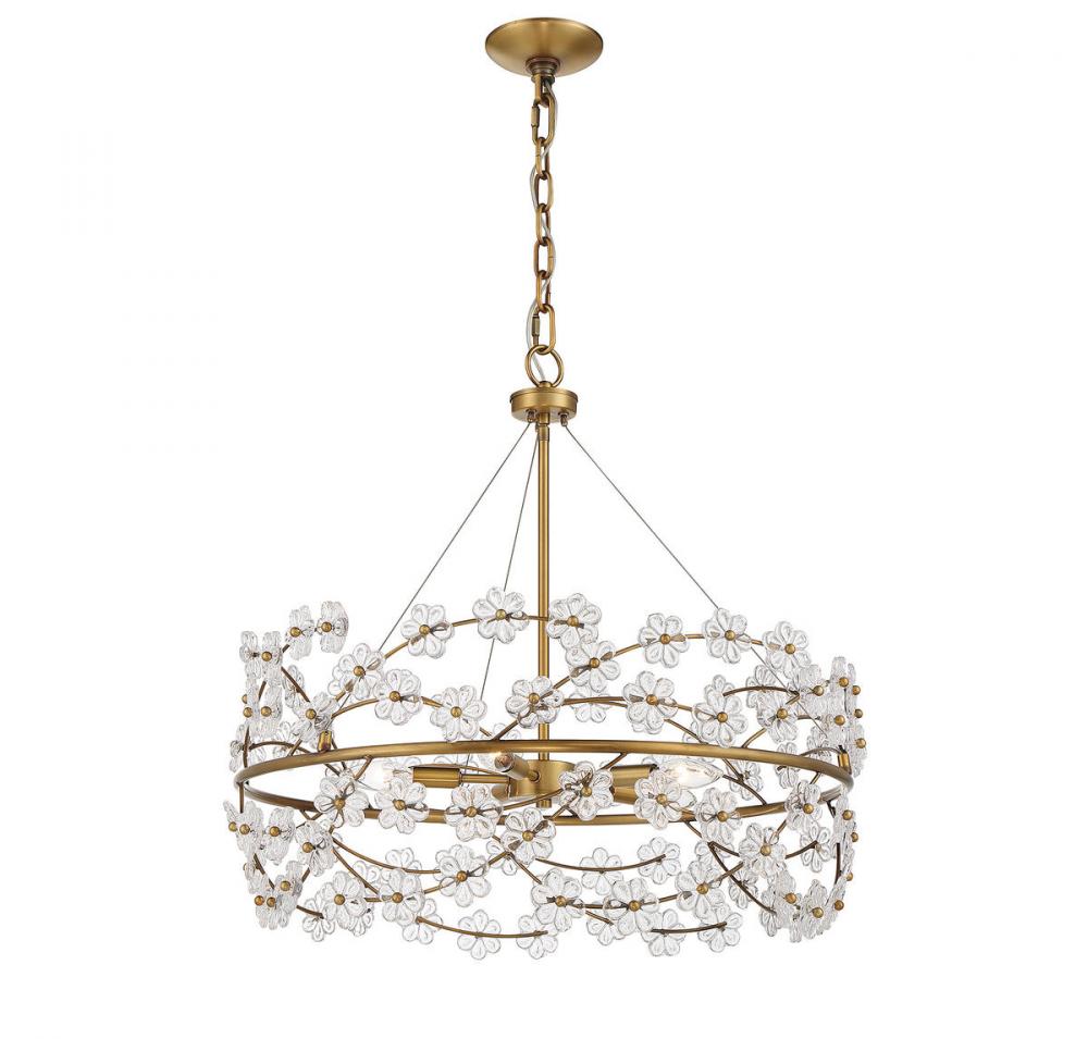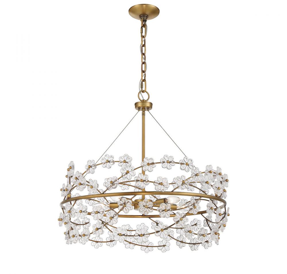 Treat your home to a bouquet of flowers with the Savoy House Camille 5-light chandelier. Sprigs of clear glass flowers burst forth from the central ring, which is finished in warm brass. Camille is 24" in height and 24" in diameter. It uses five candelabra size bulbs of up to 60 watts per bulb. Comes with 120" of chain and 144" of cord.