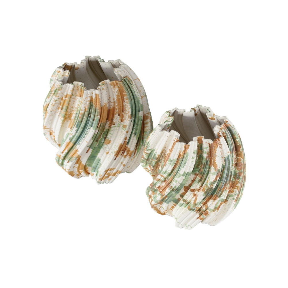 The Camouflage Medium Vase is a fusion of modern technology and artisanal vision. Crafted from 3D-printed porcelain, this vase rises in a dynamic swirl shape that is splattered with green and dark orange glaze to create a camouflage-inspired pattern on the surface of the white porcelain. Because the glaze is hand-applied, each vase will be slightly different, and the Camouflage is not water-tight.