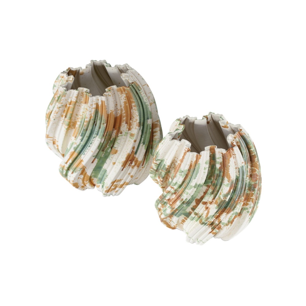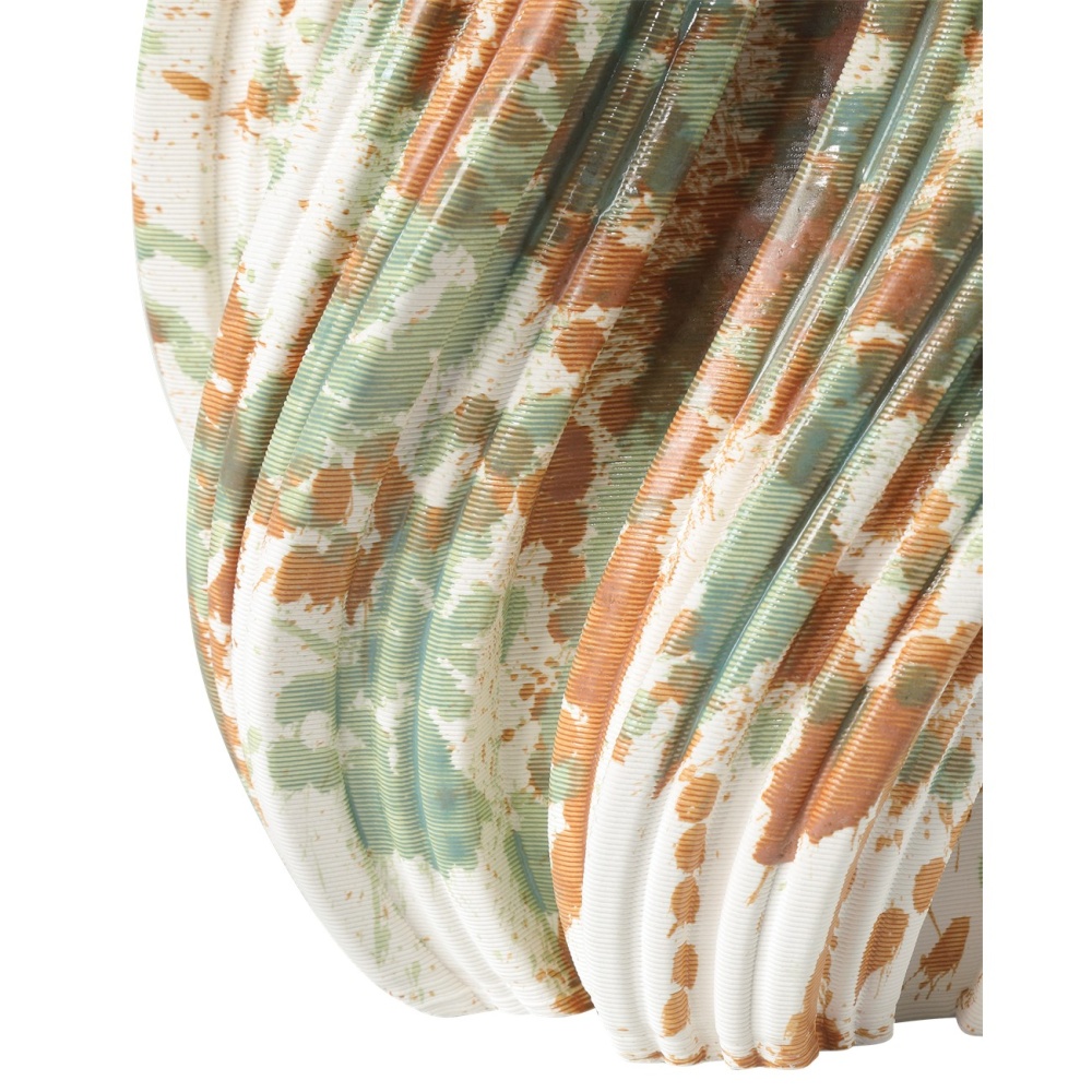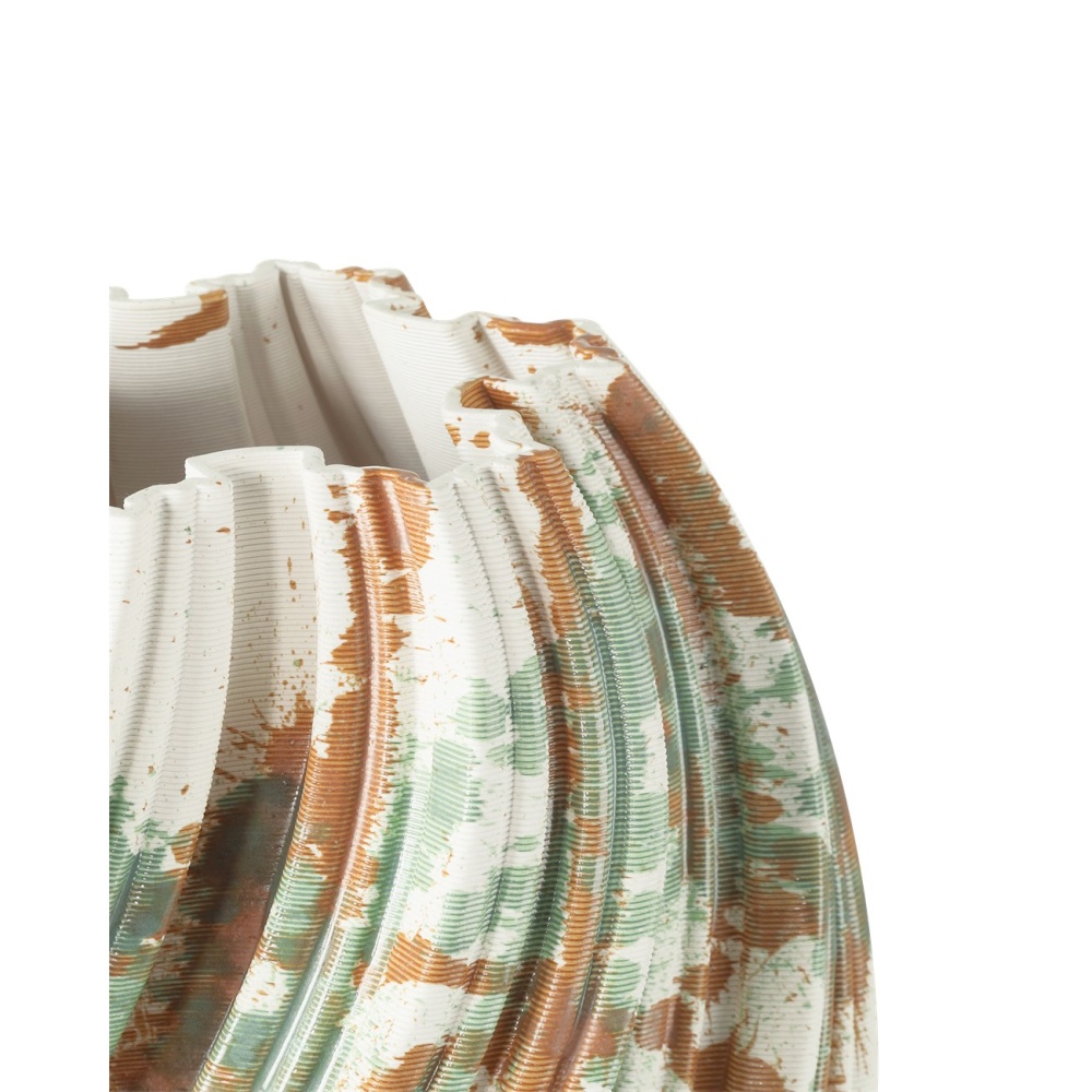 The Camouflage Small Vase is a fusion of modern technology and artisanal vision. Crafted from 3D-printed porcelain, this vase rises in a dynamic swirl shape that is splattered with green and dark orange glaze to create a camouflage-inspired pattern on the surface of the white porcelain. Because the glaze is hand-applied, each vase will be slightly different, and the Camouflage is not water-tight.