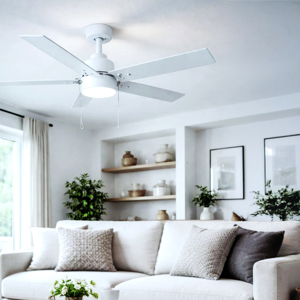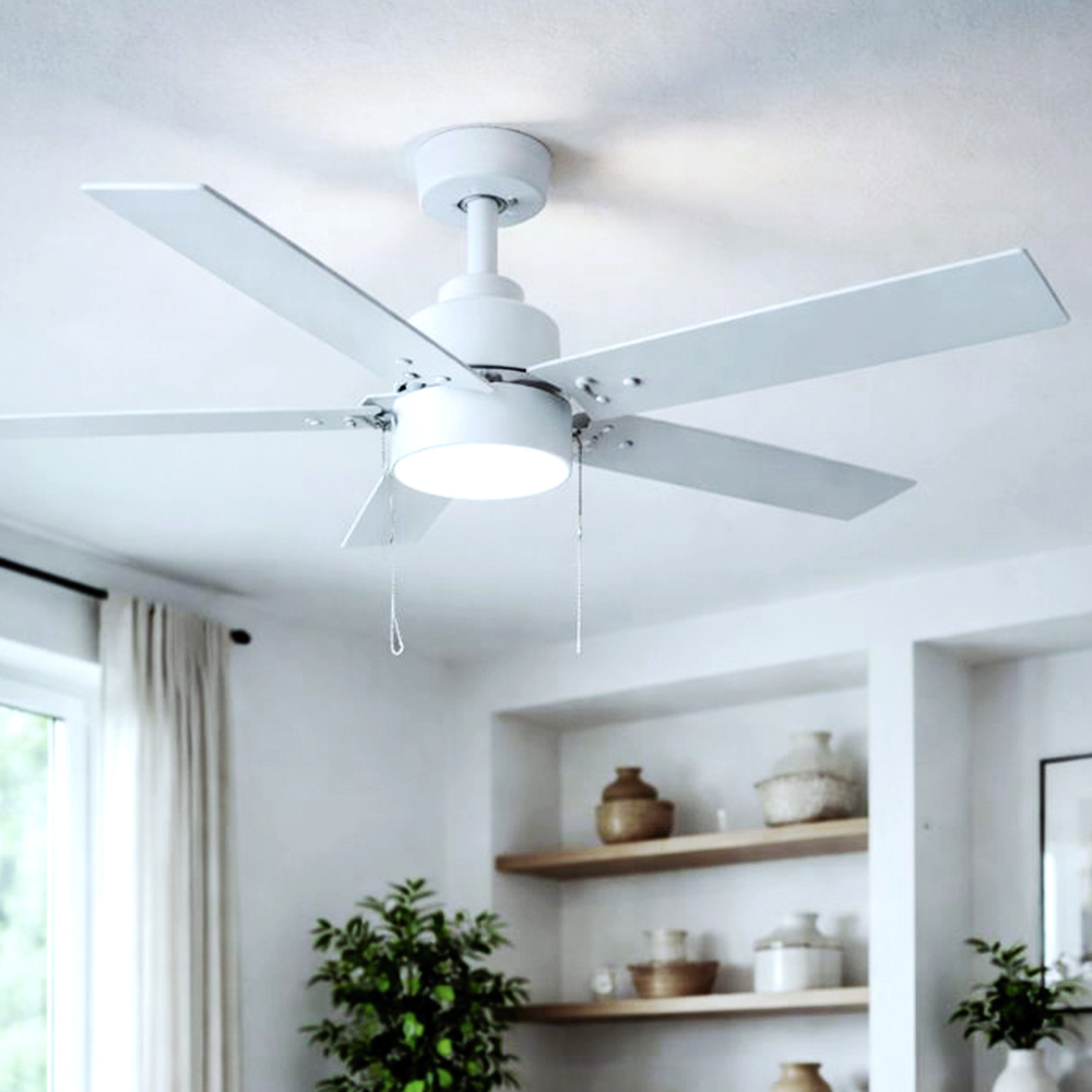Modern Clean Design: Matte white finish paired with reversible white/blonde maple blades creates a timeless, versatile aesthetic. Its streamlined silhouette complements a wide range of interiors without dominating the space.