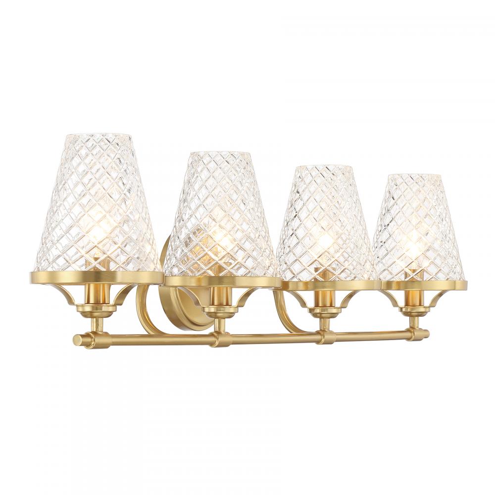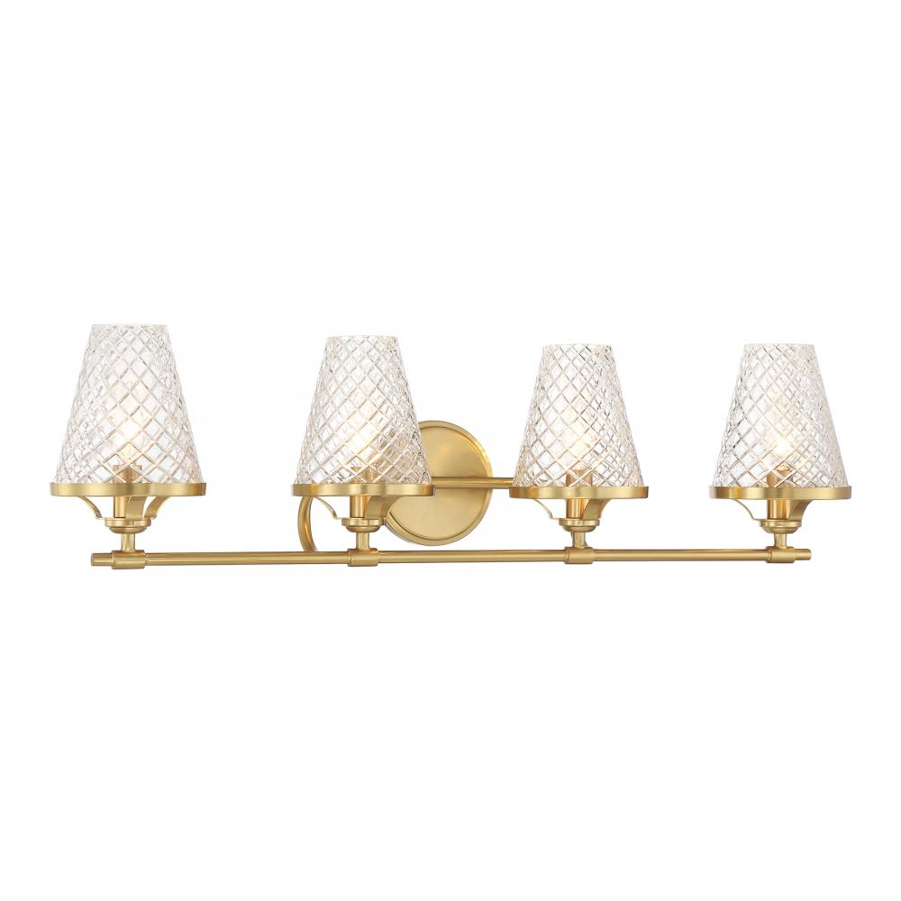 Infuse a bathroom with the vintage-inspired charm of the Candler 4-light bath bar from Savoy House. Four shades of tapered clear glass showcase a diamond pattern that adds texture, heightens the drama and recalls beautiful antique glassware. Warm Brass finish. Candler is 8.75" in height, 32" in width and extends 7.5" from the wall. Uses four candelabra size bulbs of up to 60 watts per bulb. Bulbs are not included. This bath light is damp area rated and must be installed as shown.