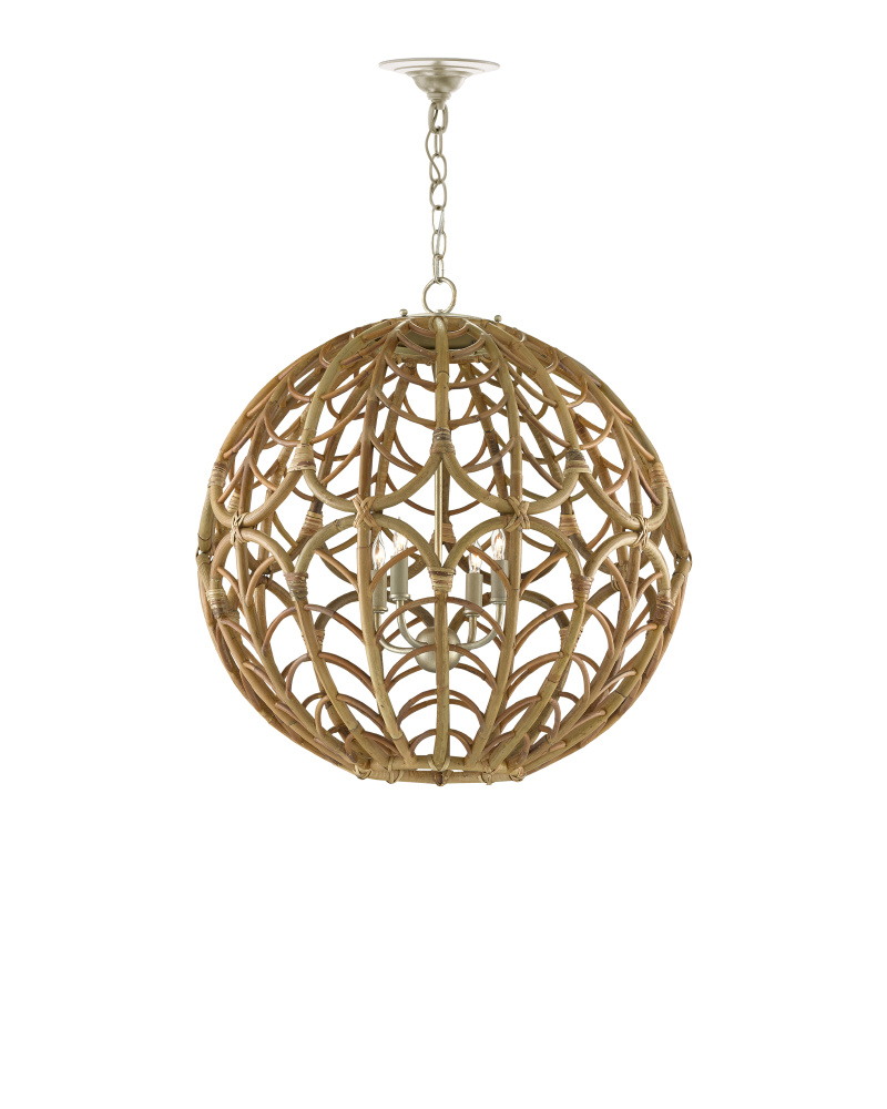 The Cape Verde Orb Chandelier is a stunning design inspired by the intricate patterns of a Lalique glass bowl. The round rattan chandelier features a woven shade that echoes the etched pattern of the glass, creating a sense of true harmony. The hardware is finished in a mix of silver leaf and smoke wood, adding to the chandelier's refined aesthetic. This design beautifully combines natural materials with elegant craftsmanship. Adjustable from 32" to 100" with use of included chain/rod kit/cable. If your space calls for a longer drop, additional chain/rods/cable is available for purchase.