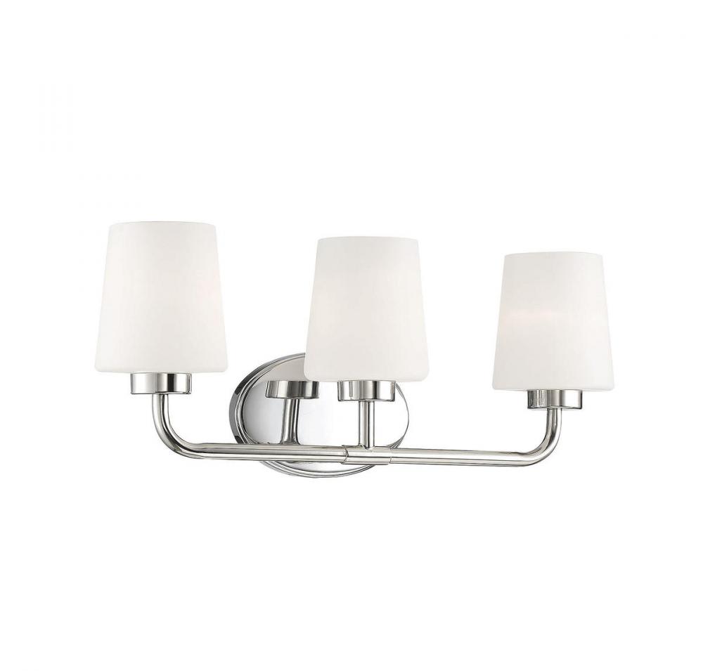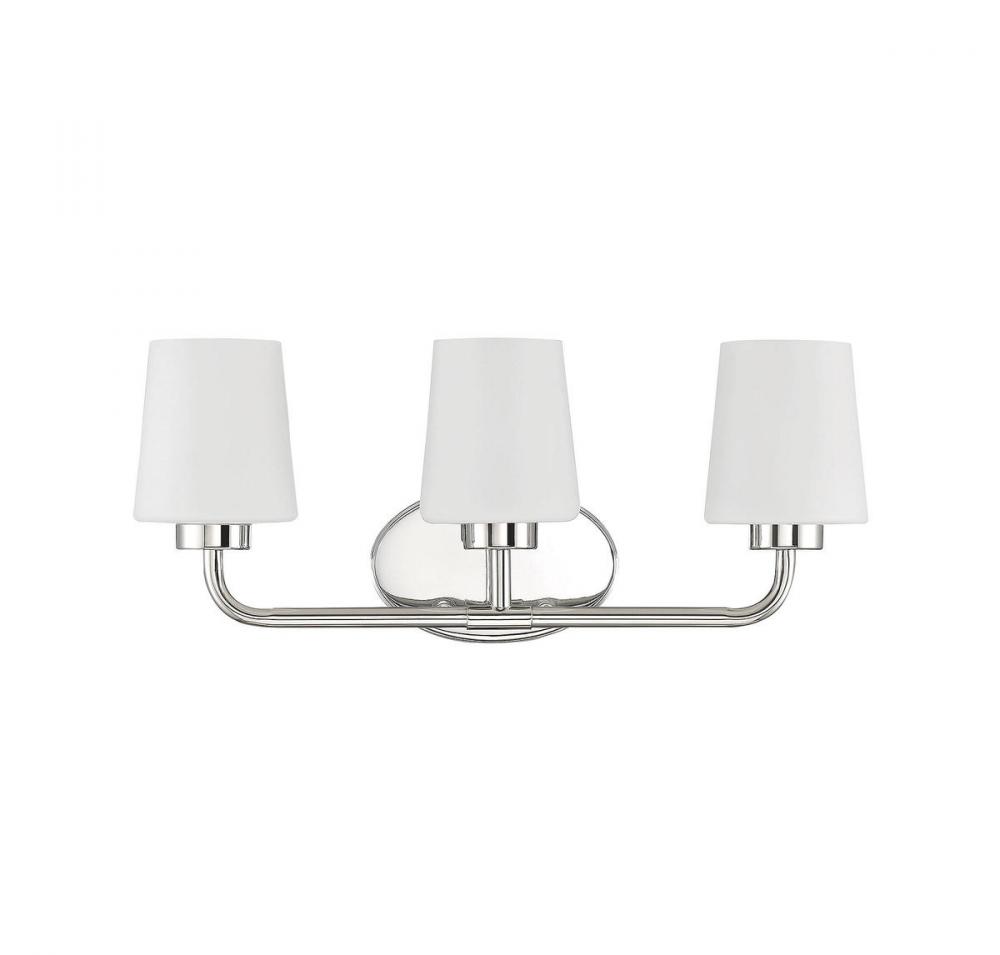 Add chic style to any bathroom with the Savoy House Capra 3-light bath bar. Its substantial structure features classic details along with white opal glassshades that are tapered like lamp shades and open at the top to give off a flattering glow. The large oval-shaped backplate helps to cover up any holes left behind from replacing old bath bars, too. Plus, the hardware for this fixture has been thoughtfully moved to the side of the backplate, allowing for a crisp and clean look. Finished in polished nickel. This fixture is 22" wide and 9" tall. It extends 6.5" from the wall. Uses 3 standard size bulbs of up to 60 watts each (not included).