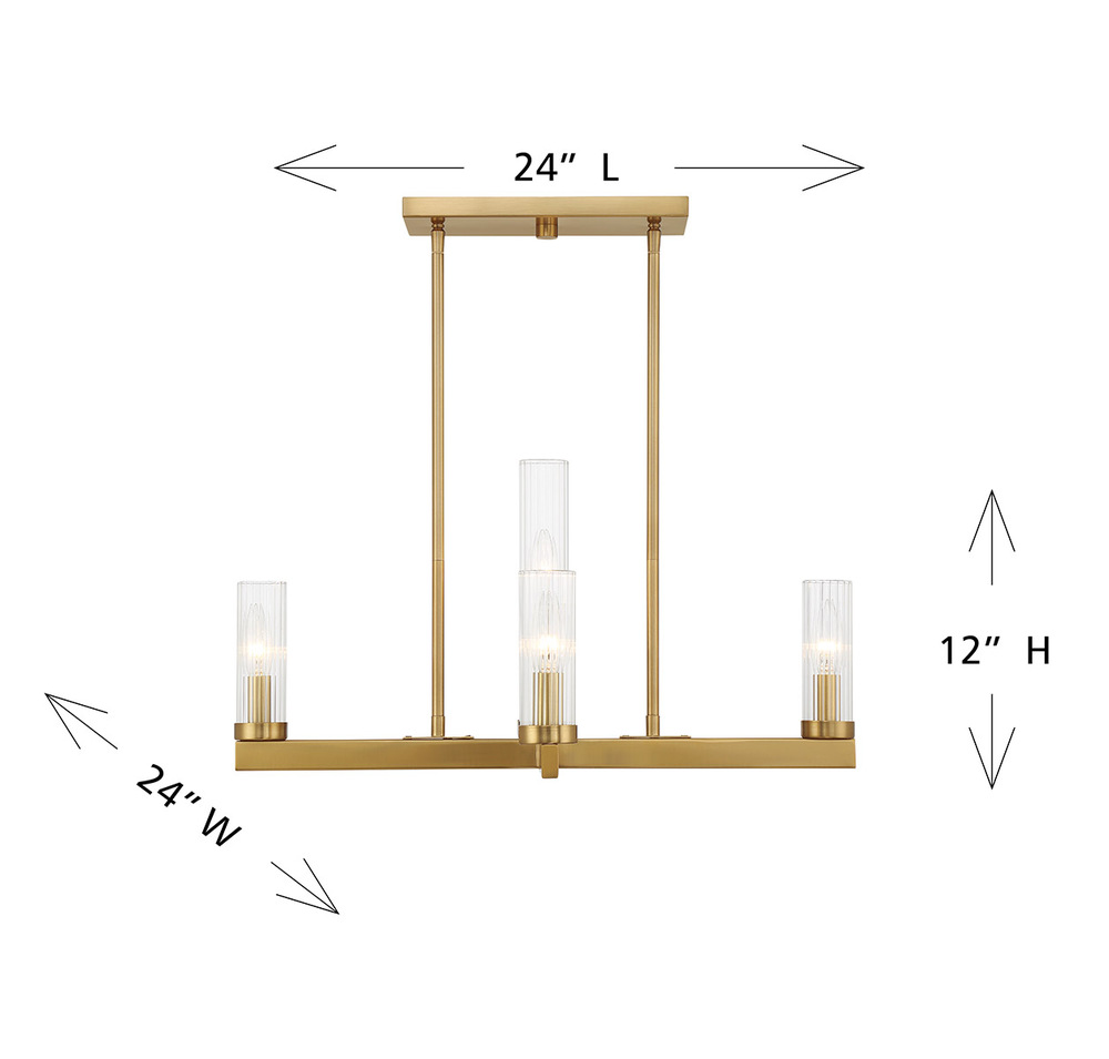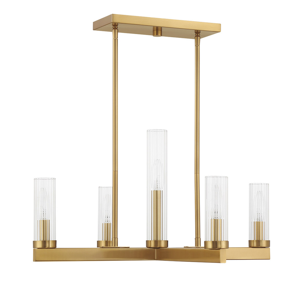 This effortlessly elegant Savoy House Carina 5-light chandelier features a beautiful Warm Brass finish and lights standing at different heights, creating a pleasing pattern that is sure to draw attention. Each light is encased in a clear ribbed glass shade to add texture. Carina is 24" in width and has an adjustable height ranging from 12" to 56". Comes with eight 12" downrods and two 6" downrods. Uses five candelabra size bulbs of up to 60 watts per bulb. Bulbs not included.
