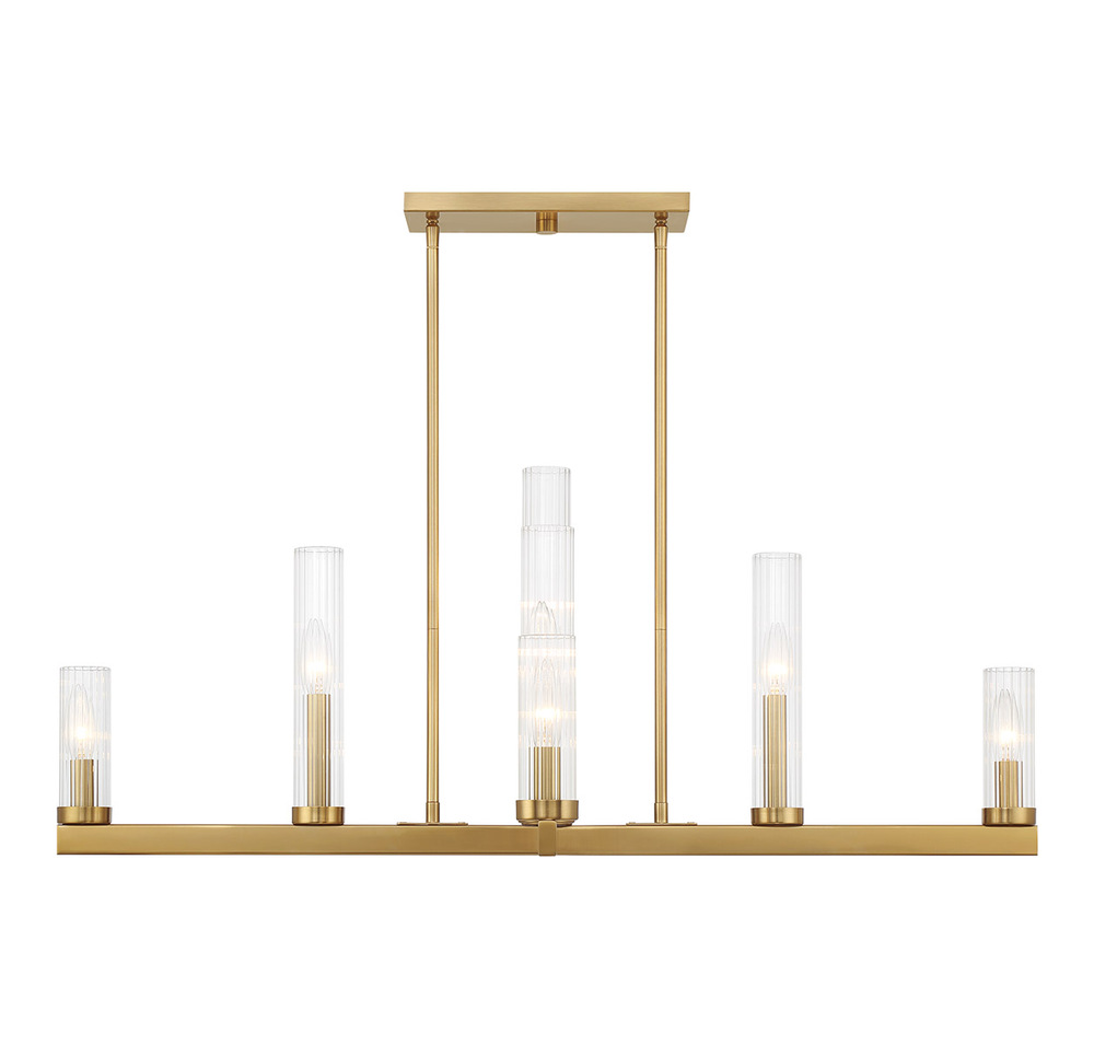 This effortlessly elegant Savoy House Carina 9-light chandelier features a beautiful Warm Brass finish and lights standing at different heights, creating a pleasing pattern that is sure to draw attention. Each light is encased in a clear ribbed glass shade to add texture. Carina is 37.75" in width and has an adjustable height ranging from 15.25" to 56". Comes with eight 12" downrods and two 6" downrods. Uses nine candelabra size bulbs of up to 60 watts per bulb. Bulbs not included.