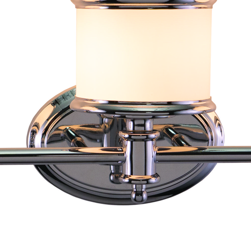 The Carlisle blends formal detailing with relaxed style for a transitional lighting collection that is sure to please. The frosted opal glass cylinders are smartly trimmed in chrome to match the rest of the fixture. This vanity is part of a full collection with coordinating pieces to decorate any room in the house. Versatile reversible mounting option lets you install this fixture up or down.