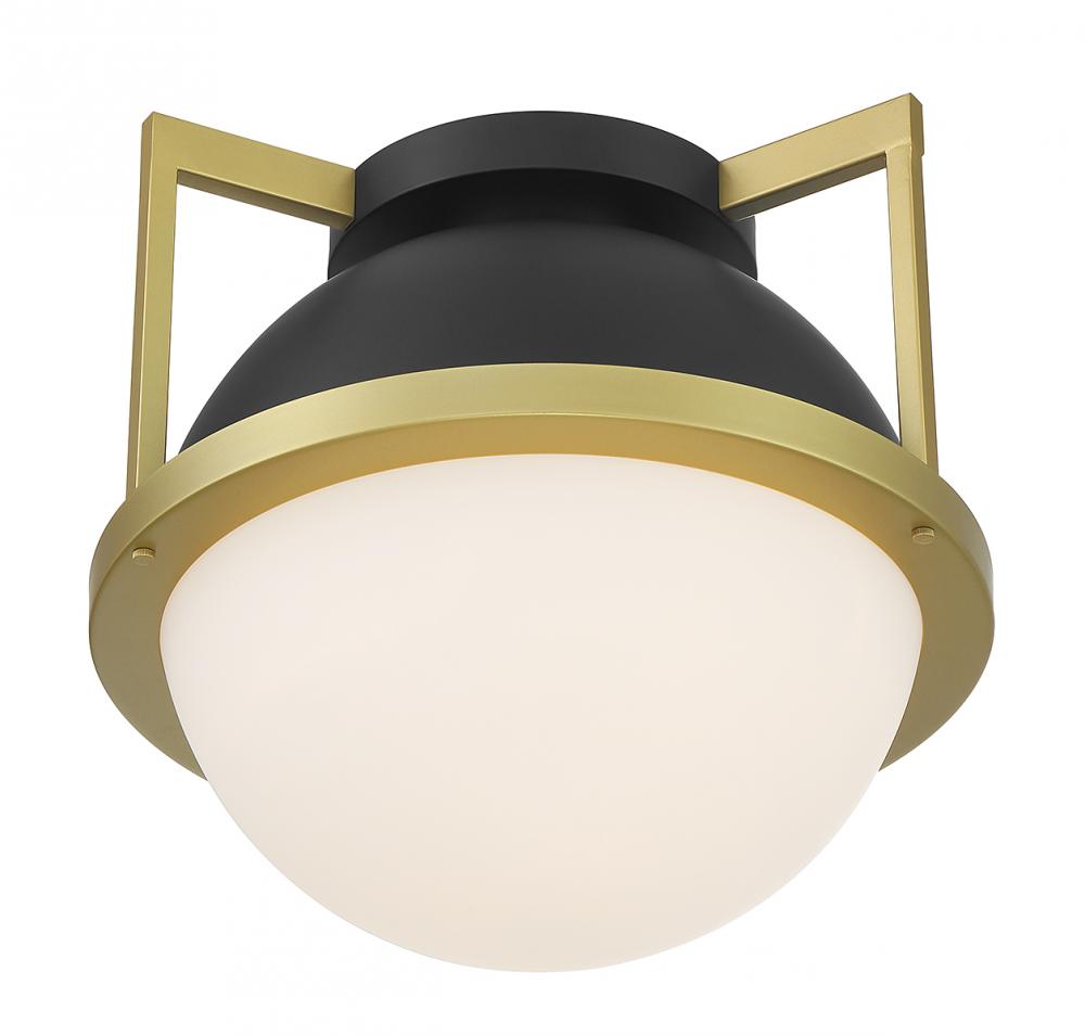 Brighten up any ceiling with the Art Deco-meets-industrial Savoy House Carlysle 1-light ceiling flush mount light. The classic combination of white opal glass and a black finish is offset beautifully by angular pronged detailing finished in gold. Carlysle is 14.25" in height and 15" in width. It uses 1 standard size bulb with a max of 60 watts (bulb not included).