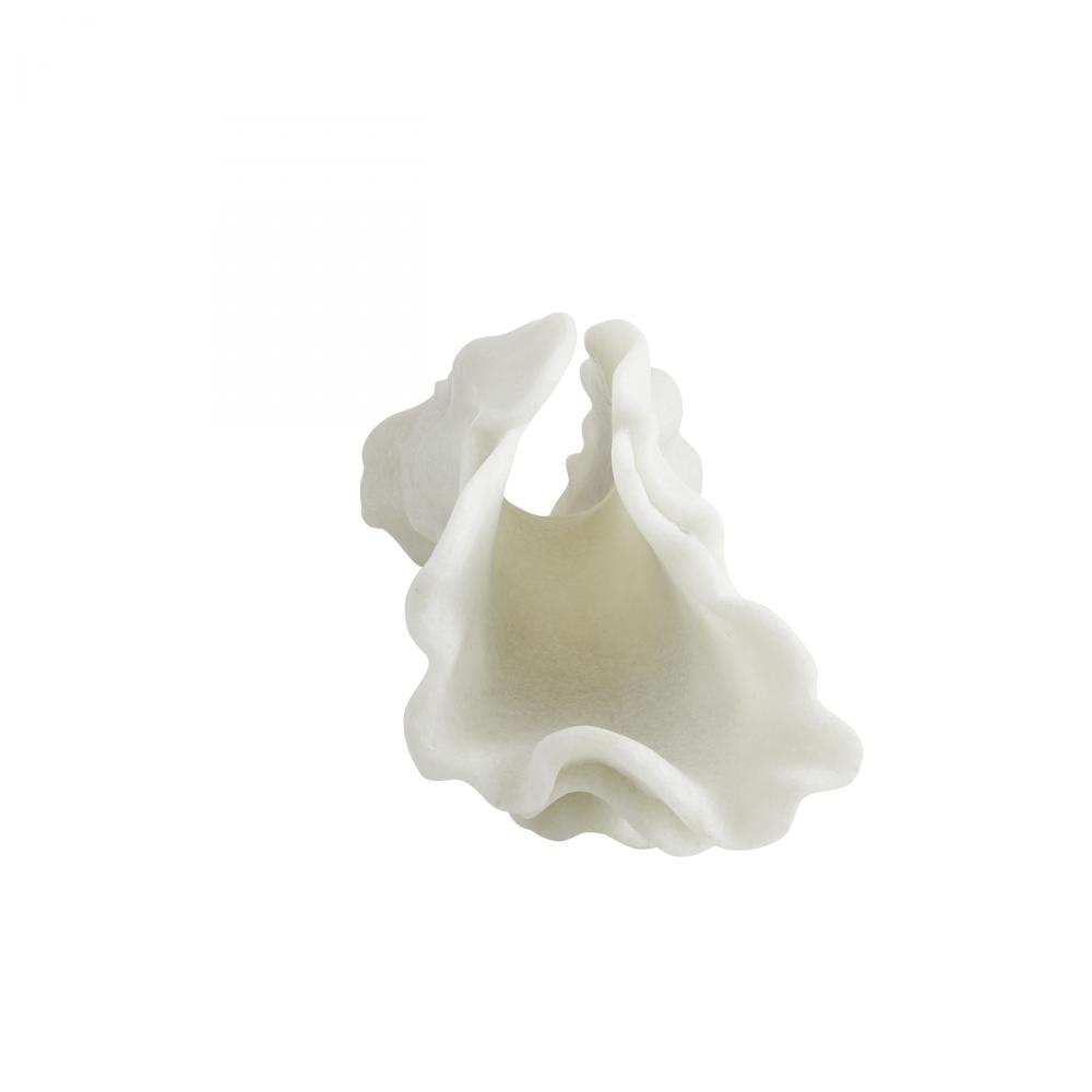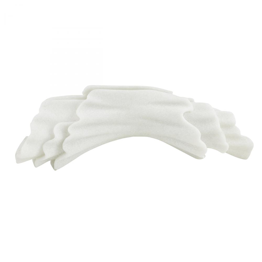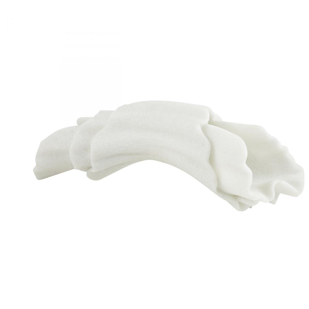 A gestural sculpture of ivory ricestone cokmposite is carved to resemble a gathered bolt of fabric. The Carnegie is an elegant accent alone or displayed as a modernist centerpiece with a floral arrangement across the rippling form. Finish will vary.