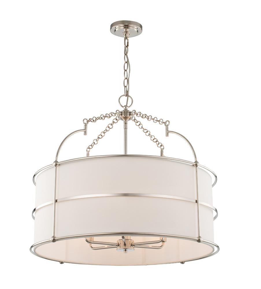 The Carson Collection features a clean linen fabric shade and Polished Nickel (PN) frame that is suspended by decorative chain links. The Polished Nickel (PN) finish contrasts and enhances the warm linen light.