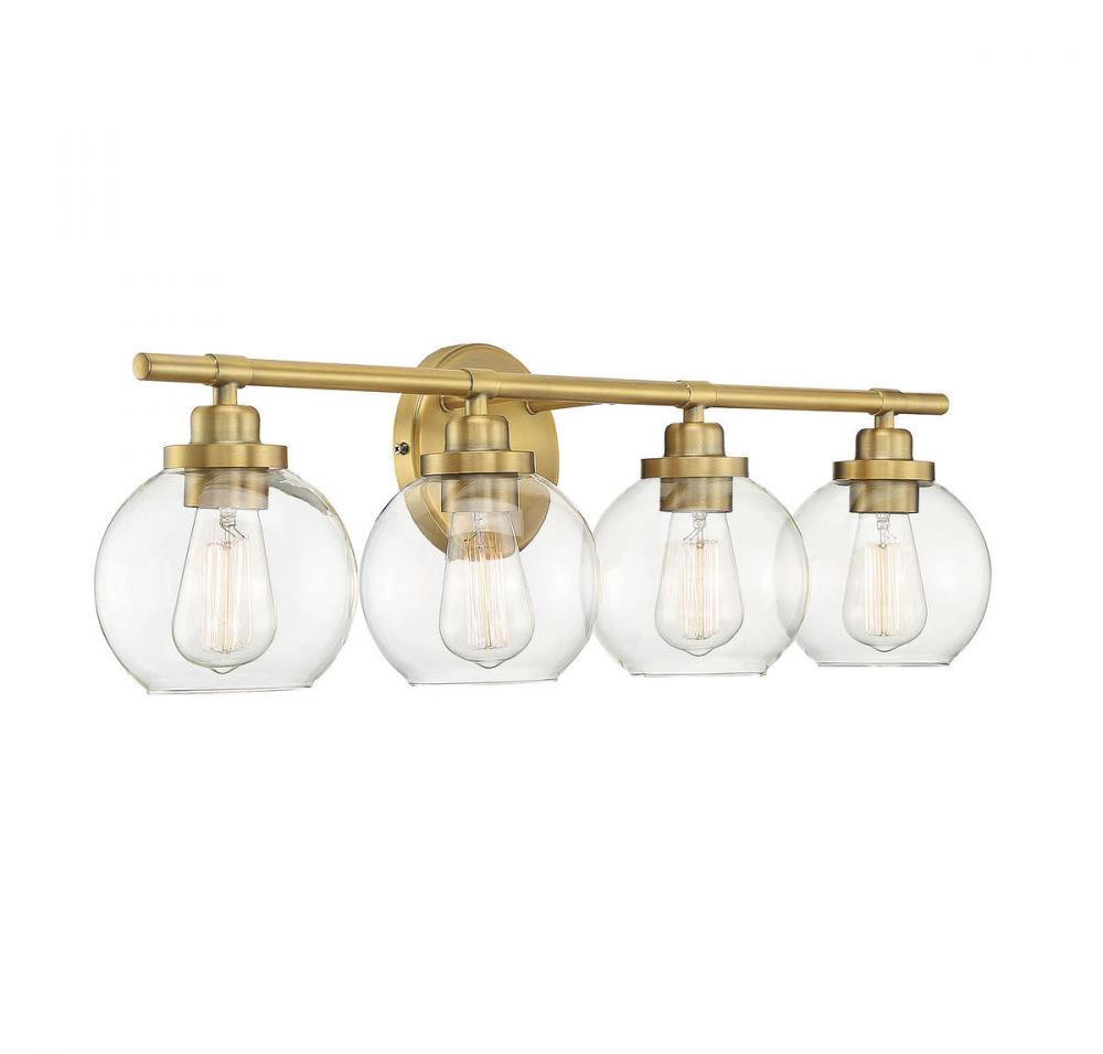 Adding the Savoy House Carson 4-light bath bar easily helps you boost the illumination and the style of any bathroom. Its fishbowl-style clear glass shadesmake a big statement and are open at the bottom, making it easy to replace the bulbs. The streamlined structure offers up subtle detailing with a mid-century modern vibe and the circular backplate echoes the shape of the glass shades. Finished in warm brass. This fixture is 30" wide and 8.5¾" tall. It extends 7" from the wall. Uses 4 standard size bulbs of up to 60 watts each (not included).