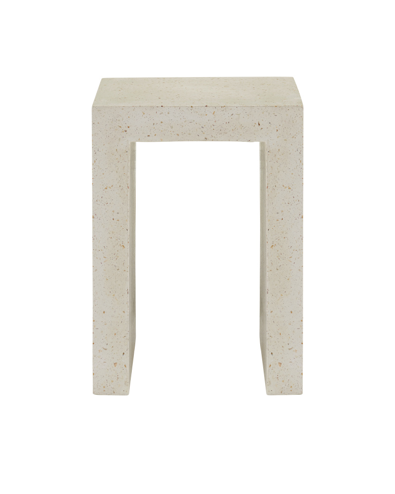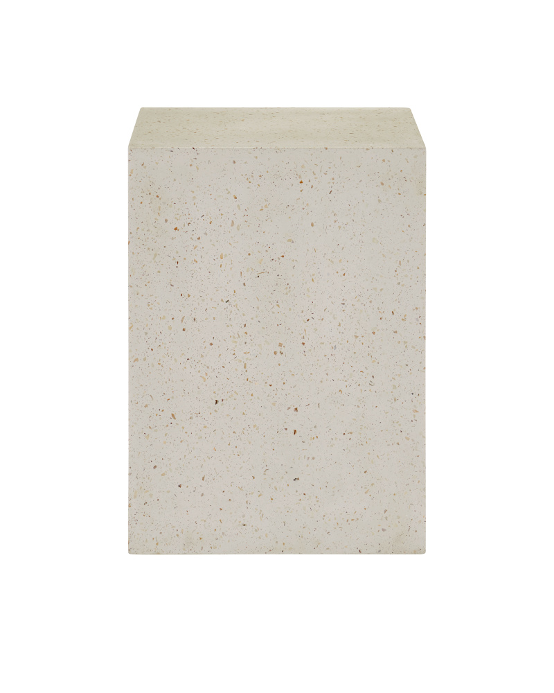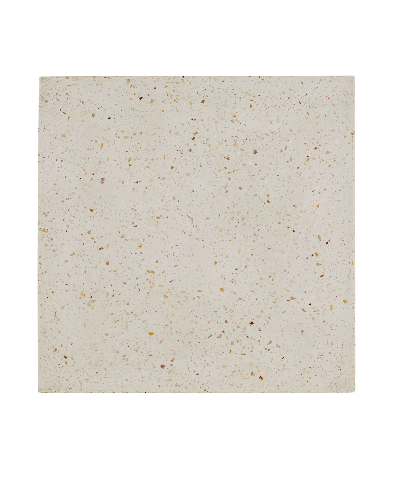 The Carson Ivory Terrazzo Accent Table is made of concrete in an ivory terrazzo finish, the combination making it both sleek and durable for outdoor rooms, terraces and loggias. The ivory side table is created in pieces in a mold and then built so it is solid and sturdy. The concrete is mixed with tempered glass fibers that read as soft amber and metallic flecks embedded in the surface, adding a hint of glint to this sleek piece.