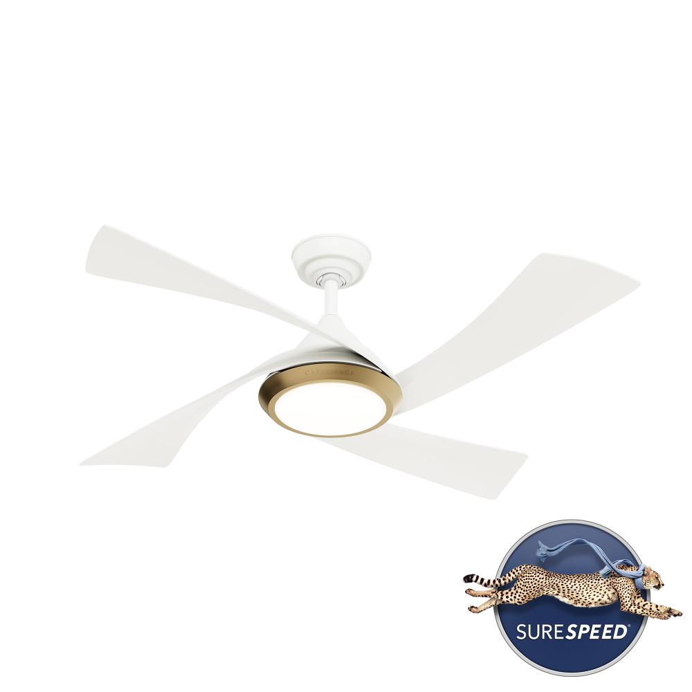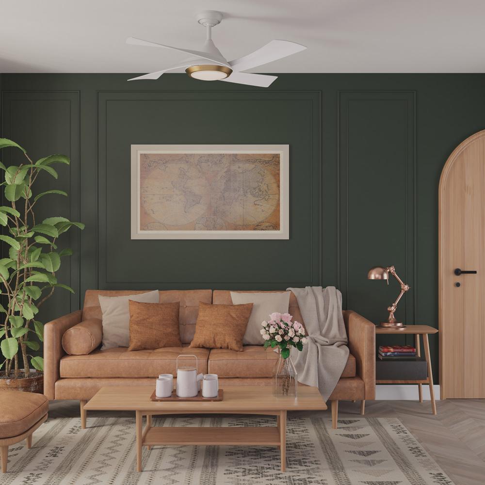 EFFORTLESS CONTROL & DIMMING: Integrated LED lighting with painted cased white glass, paired with a wall control and handheld remote for easy adjustments to fan speed and brightness.