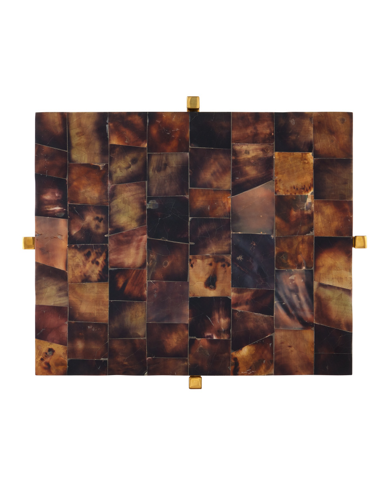 The exquisite placement of pieces of natural shell makes the Casey Penshell Brown Accent Table a fine example of true artisanship. The top is covered in a mosaic of shells that were expertly placed to cover the rectangular slab, which is inset into the metal frame like a gem. Four legs made of stainless steel in a warm brass finish are connected by an ex-shaped stretcher. The gold and mottled brown drinks table stands just over 23 inches tall.
